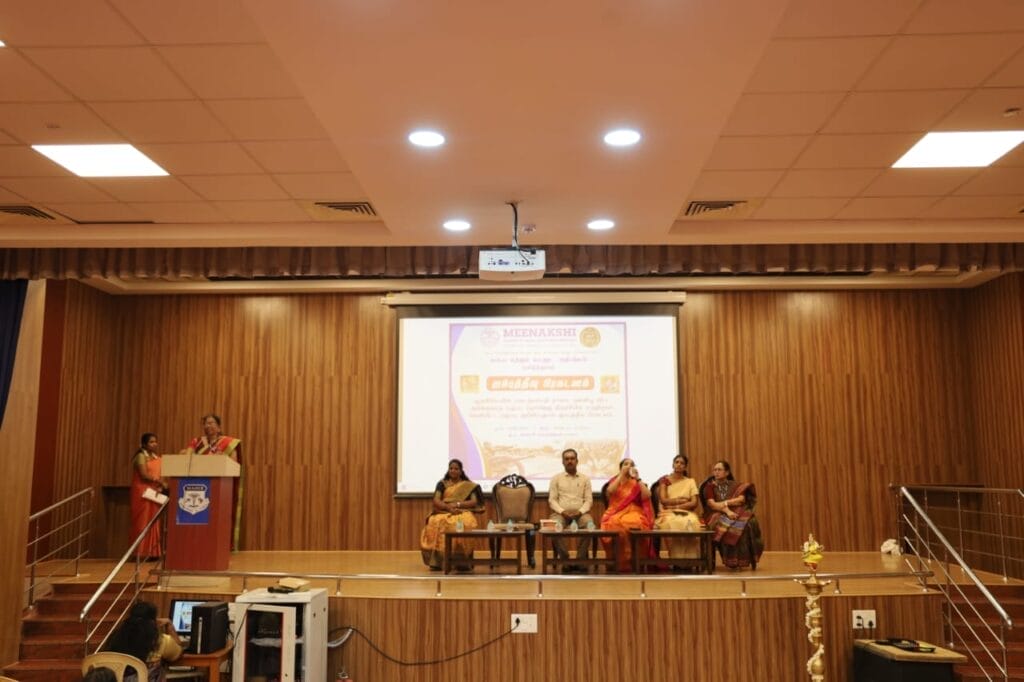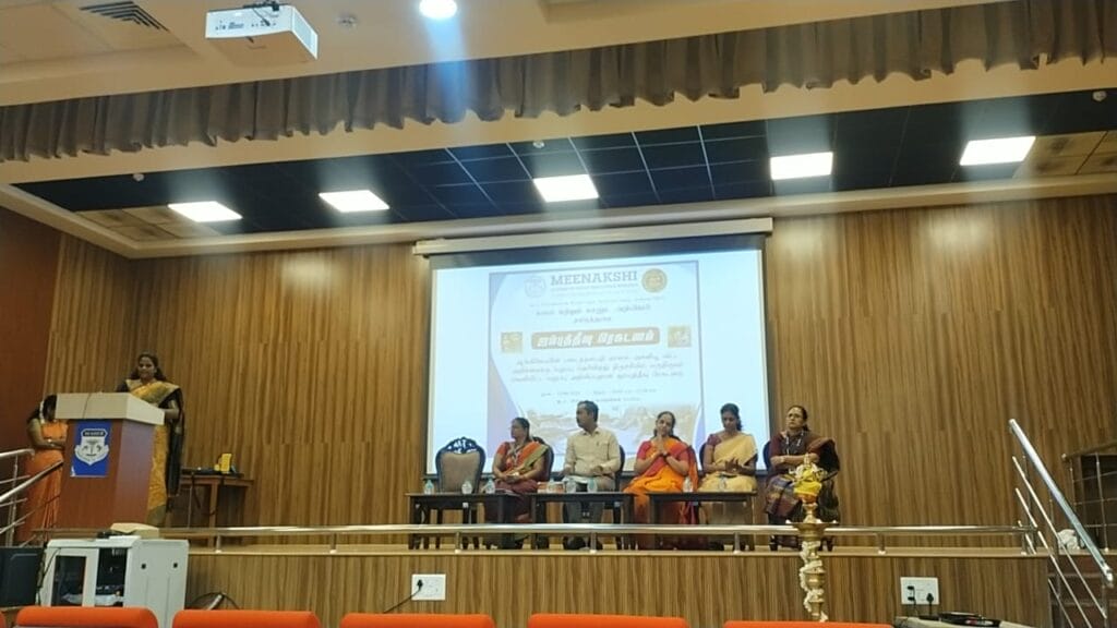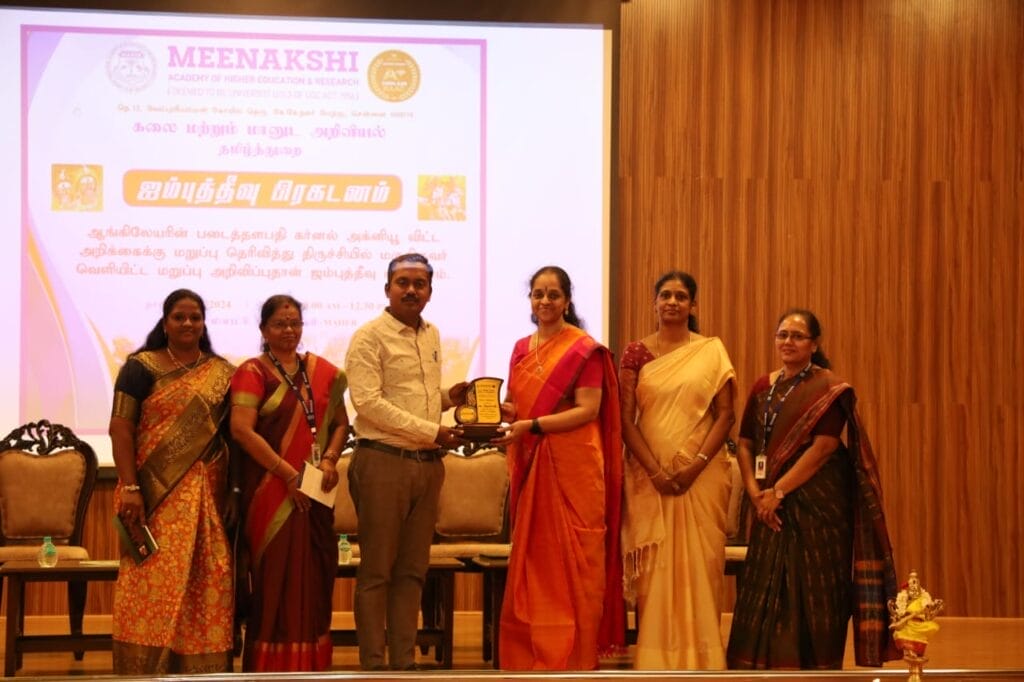 மீனாட்சி உயர்கல்வி மற்றும் ஆராய்ச்சி நிறுவனத்தின் கலை மற்றும் மானுட அறிவியல் தமிழ்த் துறையில் 15.06.2024 அன்று காலை 10.30 முதல் 12.30 வரை ஜம்புத்தீவு பிரகடனம் என்னும் தலைப்பில் பல்கலைக்கழக மானியக் குழுவின் அறிவுரையின்படி விழாவானது நடைபெற்றது.இவ்விழாவில் 210 மாணவர்கள் கலந்து கொண்டனர் விழாவின் தொடக்கமாக தமிழ்த்தாய் வாழ்த்து பாடப்பட்டது. அடுத்த அங்கமாக. குத்து விளக்கு ஏற்றுதல் நடைபெற்றது. இவ்விழாவில் சார்பு துணைவேந்தர் முனைவர் C. கிருத்திகா அவர்களும், பதிவாளர் முனைவர் சுரேகா வரலட்சுமி அவர்களும், மாணவர்கள் நலமன்ற அமைப்பாளர் முனைவர் லில்லி கிறிஸ்டோபர் அவர்களும், சிறப்பு விருந்தினர் முனைவர் மா. பிரகாஷ் (வேல்ஸ் பல்கலைக்கழகம்) அவர்களும், கலை மற்றும் மானுட அறிவியல் துறையின் முதல்வர் V. சாந்தி அவர்களும் கலந்து கொண்டு விழாவினை சிறப்பித்தனர். ஜம்புத் தீவு பிரகடனம் குறித்த வரவேற்பு தமிழ்த்துறை மூன்றாம் ஆண்டு மாணவி ராஜராஜேஸ்வரி நிகழ்த்தினார். விழாவிற்கு வரவேற்புரை முனைவர் க அமலா கார்த்திகா அவர்கள் வழங்கினார். வாழ்த்துரை முனைவர் v. சாந்தி அவர்கள் வழங்கினார். சிறப்பு விருந்தினர் அவர்களுக்கு முனைவர் C.கிருத்திகா அவர்கள் சிறப்பு செய்தார். சிறப்பு விருந்தினர் குறித்த ஒரு அறிமுக உரையை முனைவர் செ.மகேஸ்வரி அவர்கள் வழங்கினார். மருதுபாண்டியர்கள் ஜம்புத்தீவு பிரகடனம் என்ற பெயரில் அறிக்கை சமர்ப்பித்தது குறித்து விளக்கமான ஒரு ஆய்வு உரையை முனைவர் ம. பிரகாஷ் அவர்கள் நிகழ்த்தினார். ஜம்புத்தீவு பிரகடனம் குறித்த காணொளி காட்சிகள் மாணவர்களுக்கு திரை காட்சிகளாக காண்பிக்கப்பட்டது. விழாவின் நிறைவாக திரு.ப.குமாரவேல் அவர்கள் நன்றியுரை வழங்கினார். நாட்டுப்பண்ணுடன் விழாவானது இனிதே நிறைவுற்றது.