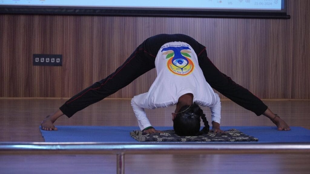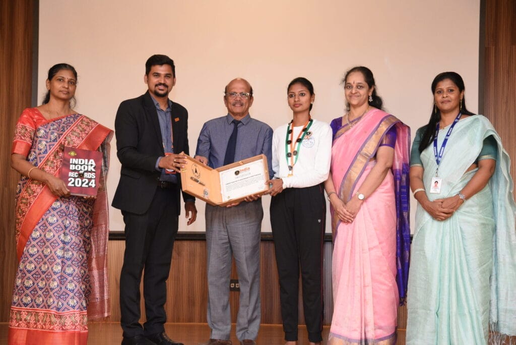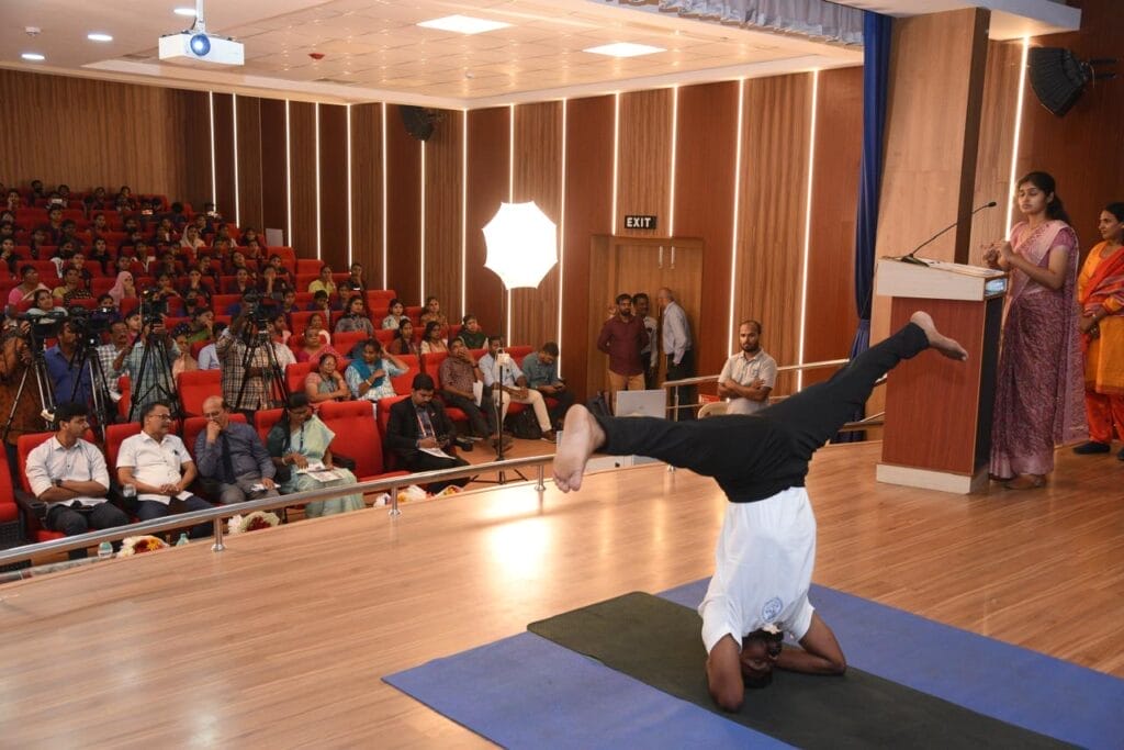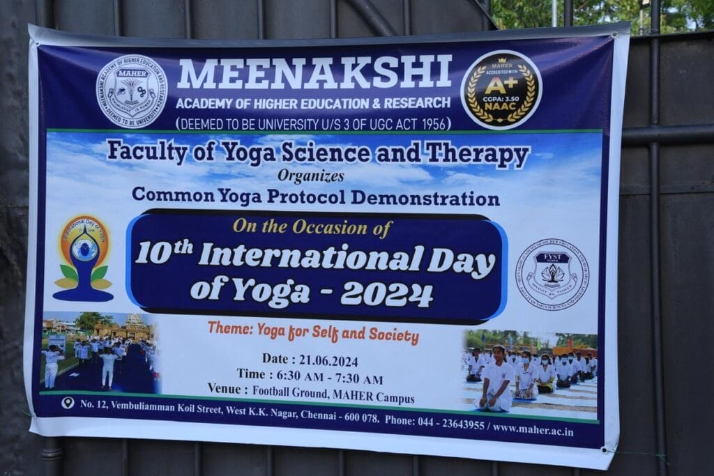 International Yoga Day 2024 was celebrated on June 21st, at Meenakshi Academy of Higher Education and Research (Deemed to be university) West KK Nagar, Chennai. The festival started with a yoga practice at basketball ground in the university campus at 7 am in which more than hundred students participated to create awareness about the practice of yoga for a healthy body and mind, the next highlight event was the attempt by M. Rajesh, a second year student of M.Sc. Yoga Therapy, and S. Priyadarshini, a second year student of M.Sc. Yoga of the Faculty of yoga science and therapy, holds the yoga posture of ‘salamba sirsasana konasana’ and ‘prasarita pada uttanasana’ respectively for the longest duration. M. Rajesh held the posture for 12 minutes and 1 second and S. Priyadarshini held the posture for 50 minutes and 51 seconds respectively and entered the “India Book of Records”. S. Priyadarshini already holds a record of holding ‘ Raja kapotasana’ for the longest duration of 60 minutes in the year 2022. With the blessings of the founder Chancellor Late Hon. A.N. Radhakrishnan,Mrs. Gomati Radhakrishnan Interim Chancellor and Mrs. Jayanthi Radhakrishnan Pro Vice Chancellor, the event was started with an inaugural address by Prof. Dr. R.S. Neelakandan Vice-Chancellor, Prof. Dr. C. Krithika, Pro Vice Chancellor delivered the special address. Dr. V. Subbulakshmi, principal Faculty of Yoga Science and Therapy delivered the welcome address. Renowned yoga therapist and consultant Dr. N. Chandrasekaran was the chief guest of the day. Mr. Vivek R Nair, from India Book of Records was the Adjudicator of the record breaking attempts who officially declared the achievement and felicitated the achievers with the medal.