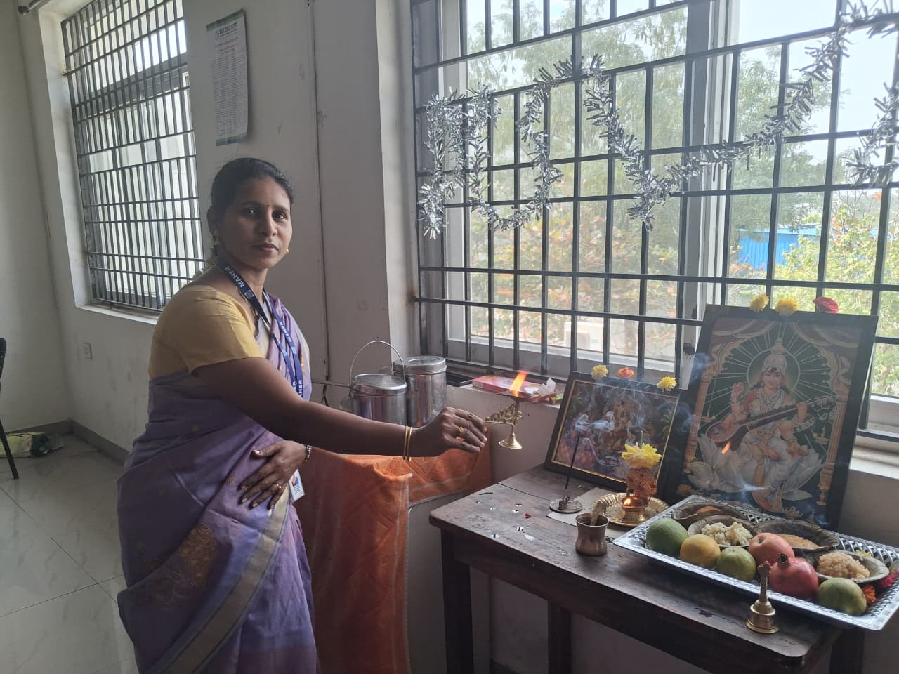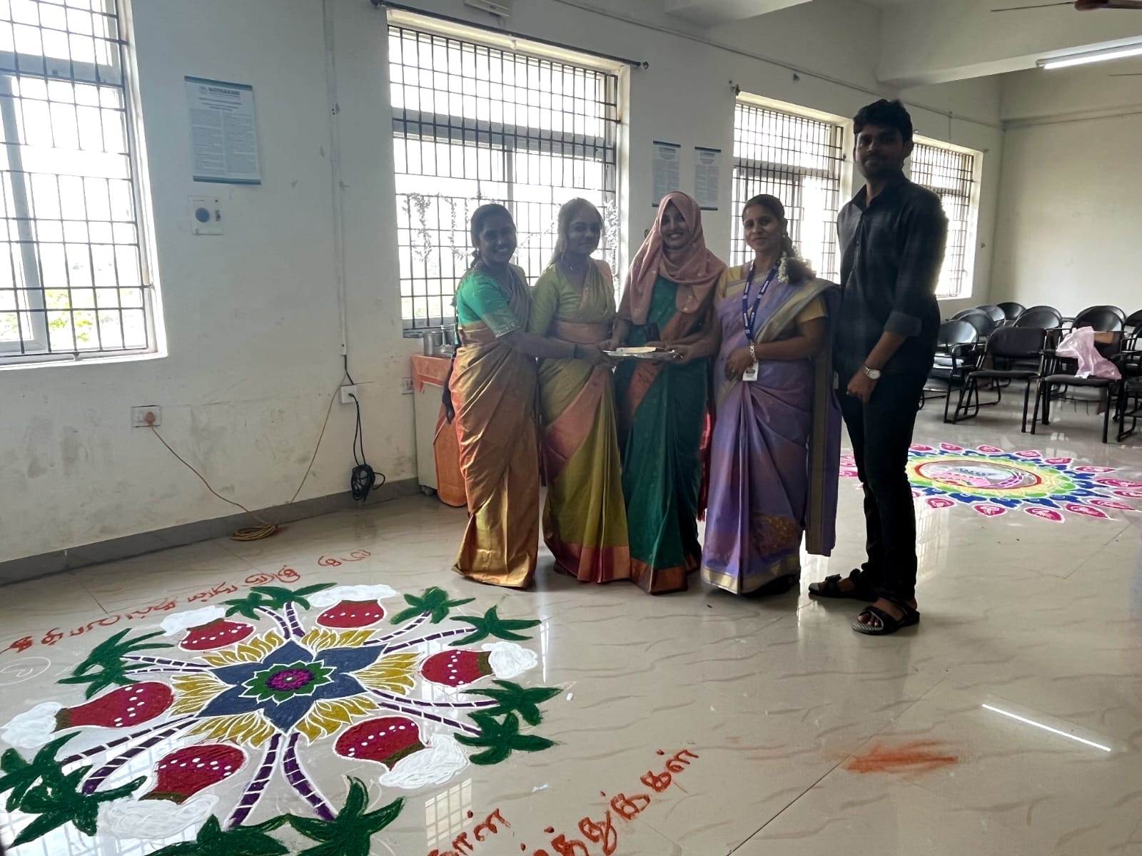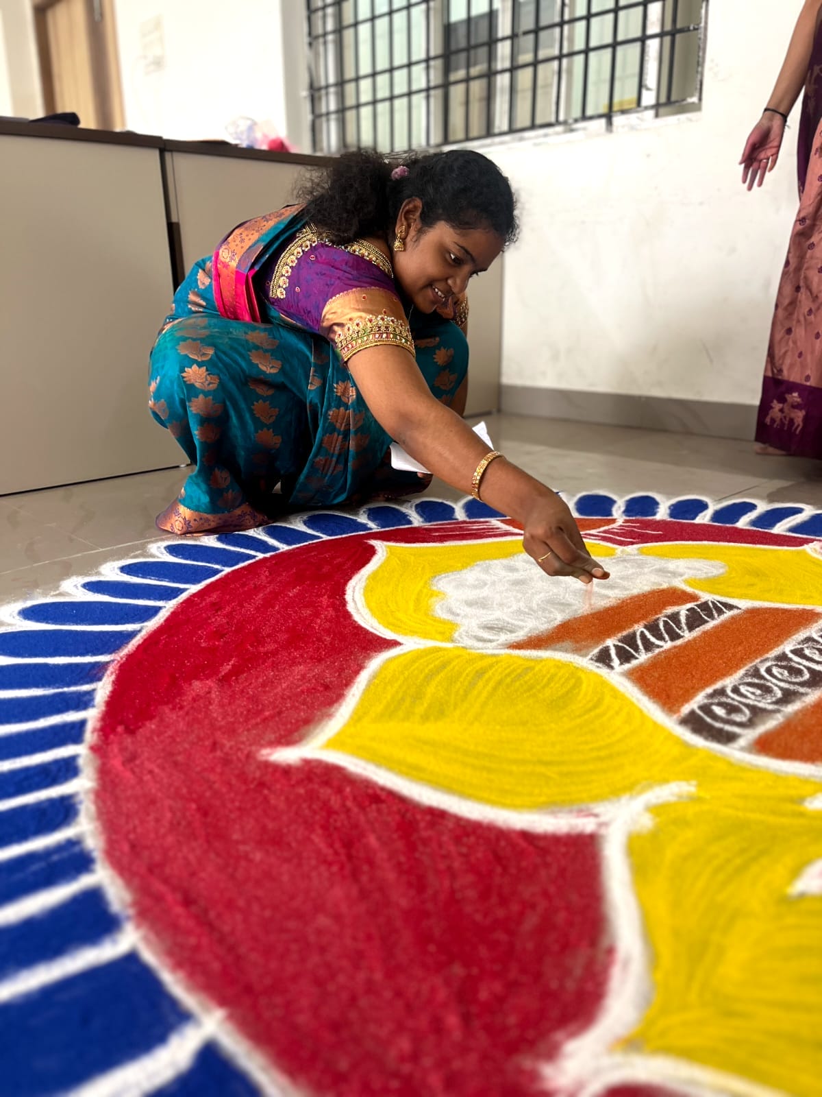 The programme began with a Faculty Pooja, invoking divine blessings and setting an auspicious tone for the celebrations. This was followed by a Rangoli Competition, where faculty members creatively expressed traditional themes through vibrant designs. The entries were evaluated based on creativity, neatness, and relevance to the festive theme, and the winners were appreciated with prizes.