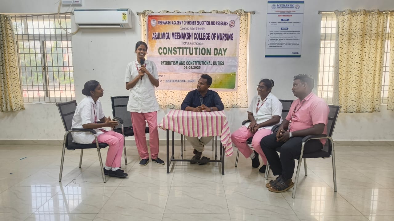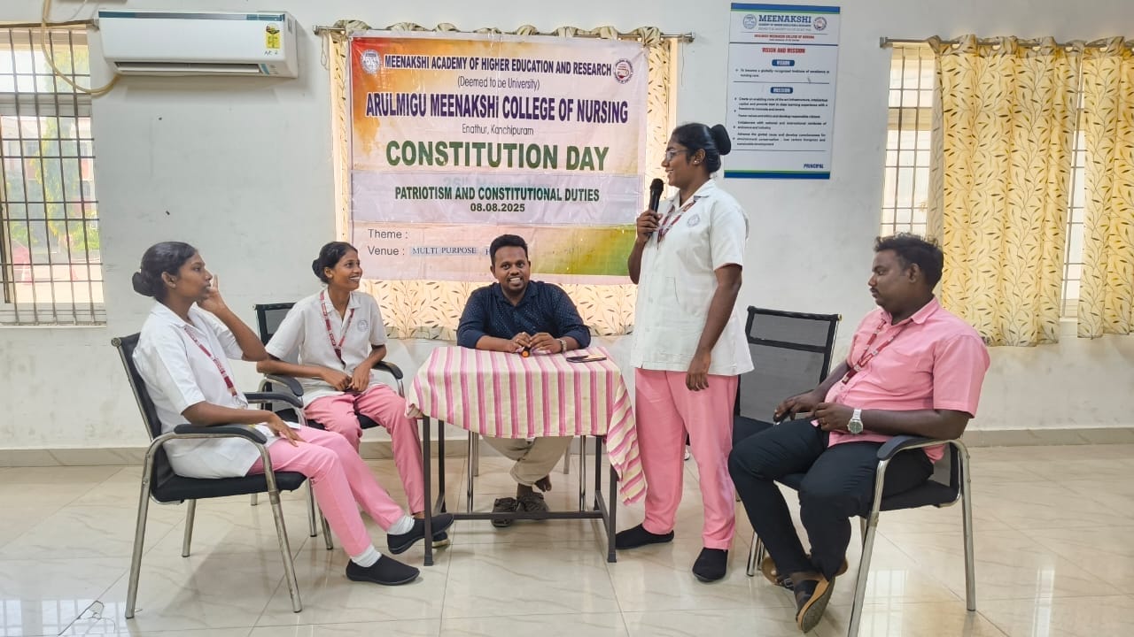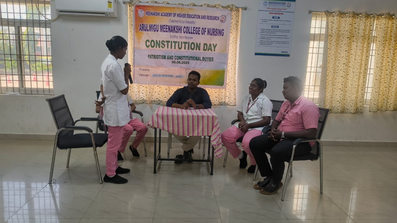 The Commemoration of Constitution Day 2025 was observed on 8th August 2025 at 10:00 a.m. in the Multipurpose Hall of Arulmigu Meenakshi College of Nursing (AMCON). The event aimed to create awareness among students about the values of the Constitution and the responsibilities of every citizen in nation-building.