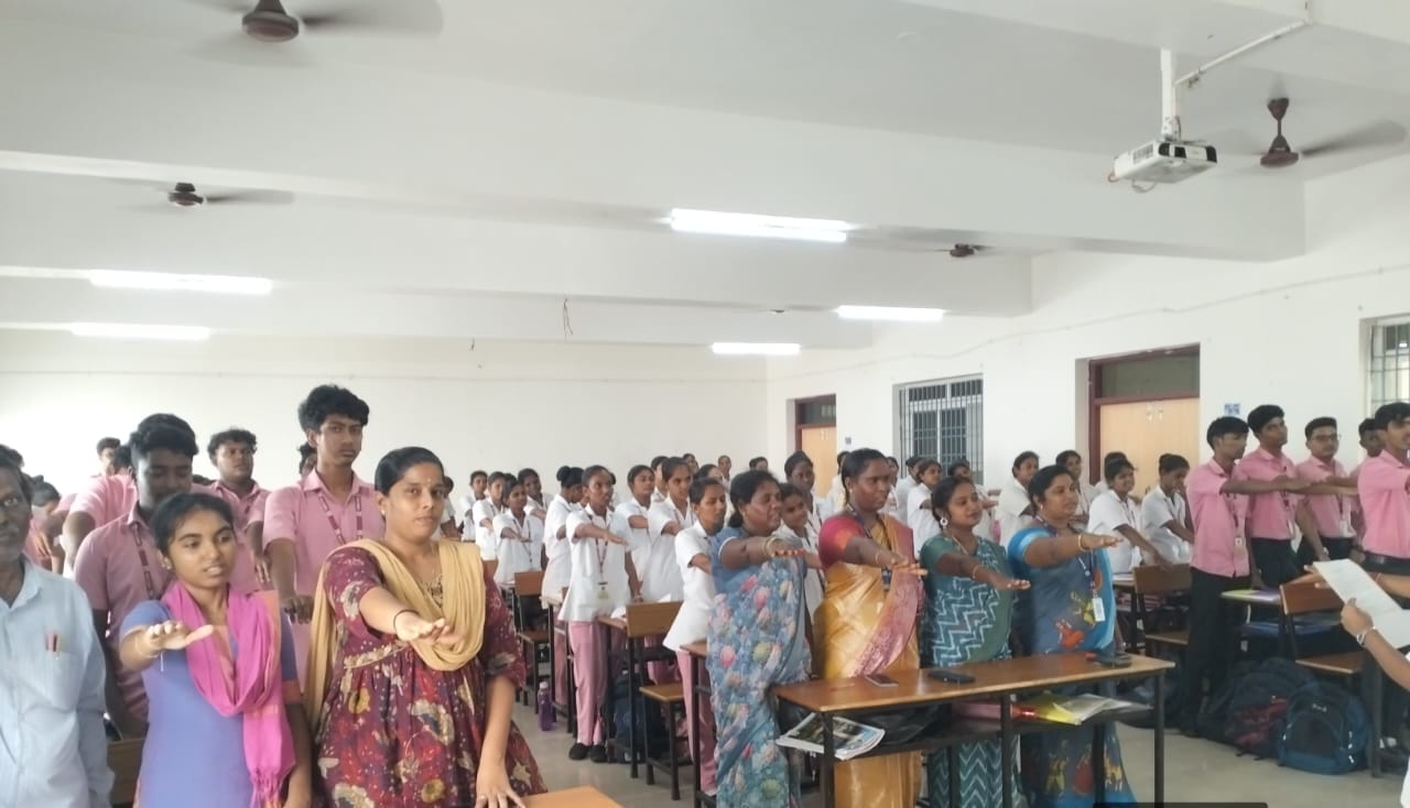 The keynote address was delivered by Mrs. S. Uma, Associate Professor, who elaborated on the theme “Ageing with Dignity”, highlighting the rights of senior citizens and the role of healthcare professionals in ensuring their holistic well-being. A pledge was then taken by faculty, students, and non-teaching staff to uphold the values of dignity, empathy, and support for the elderly.