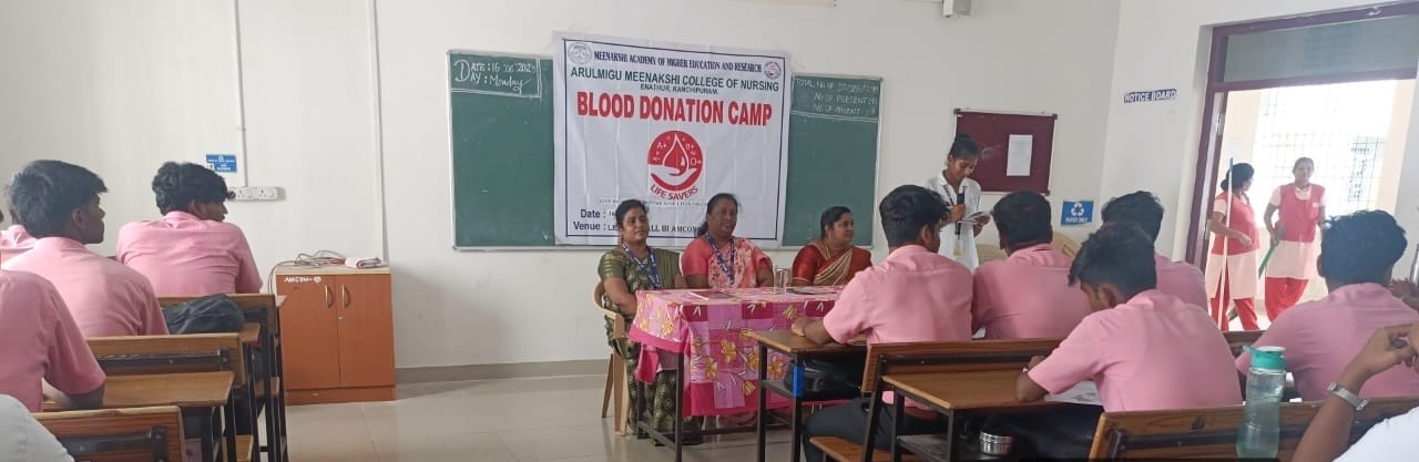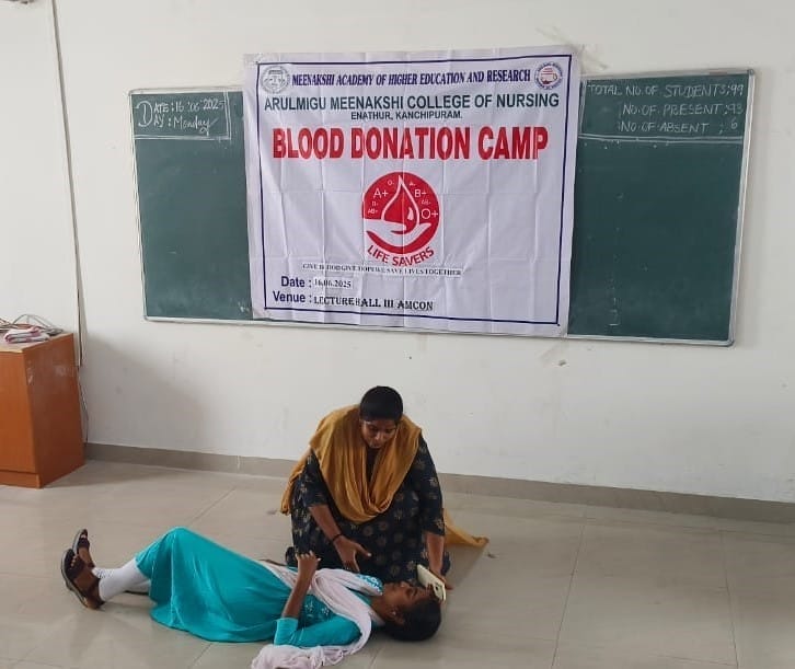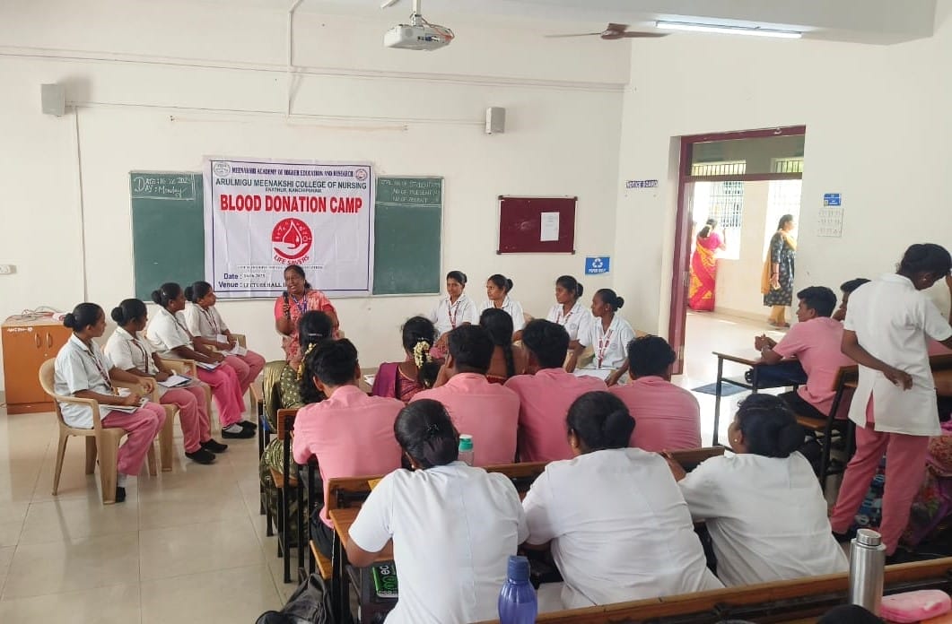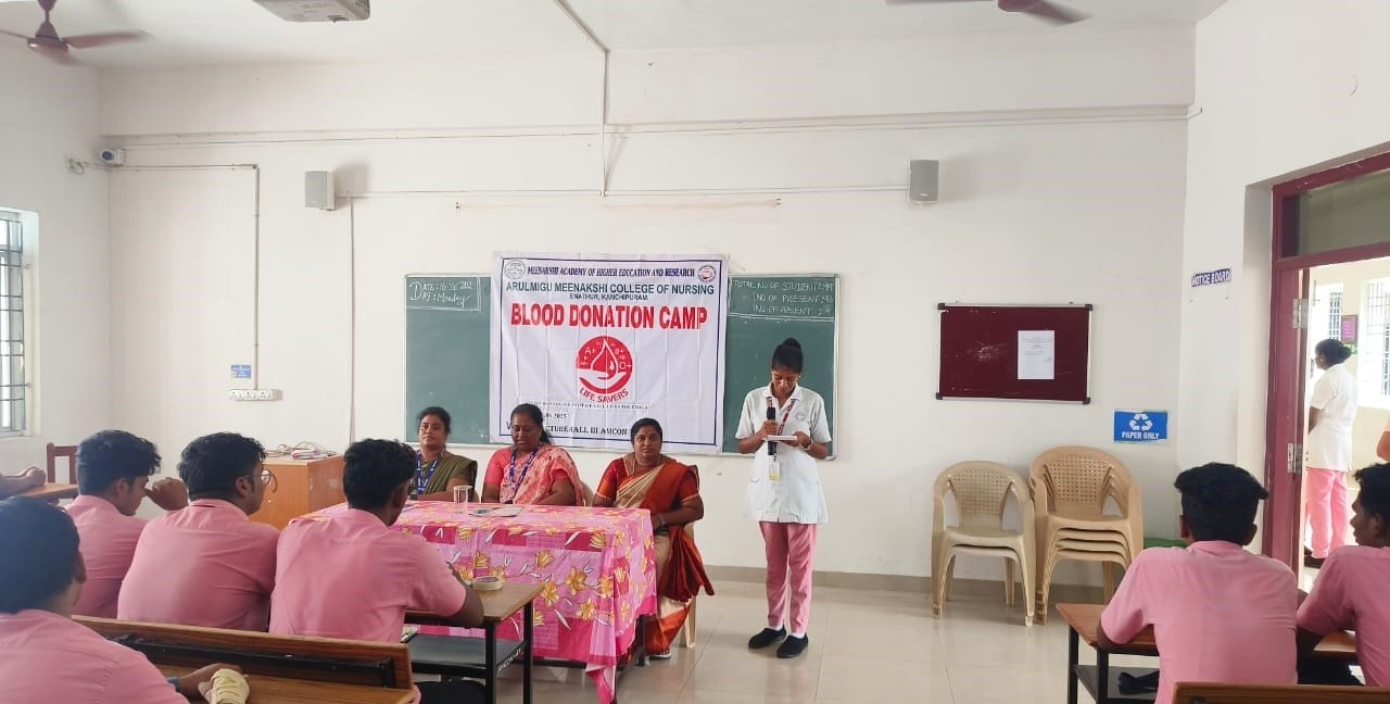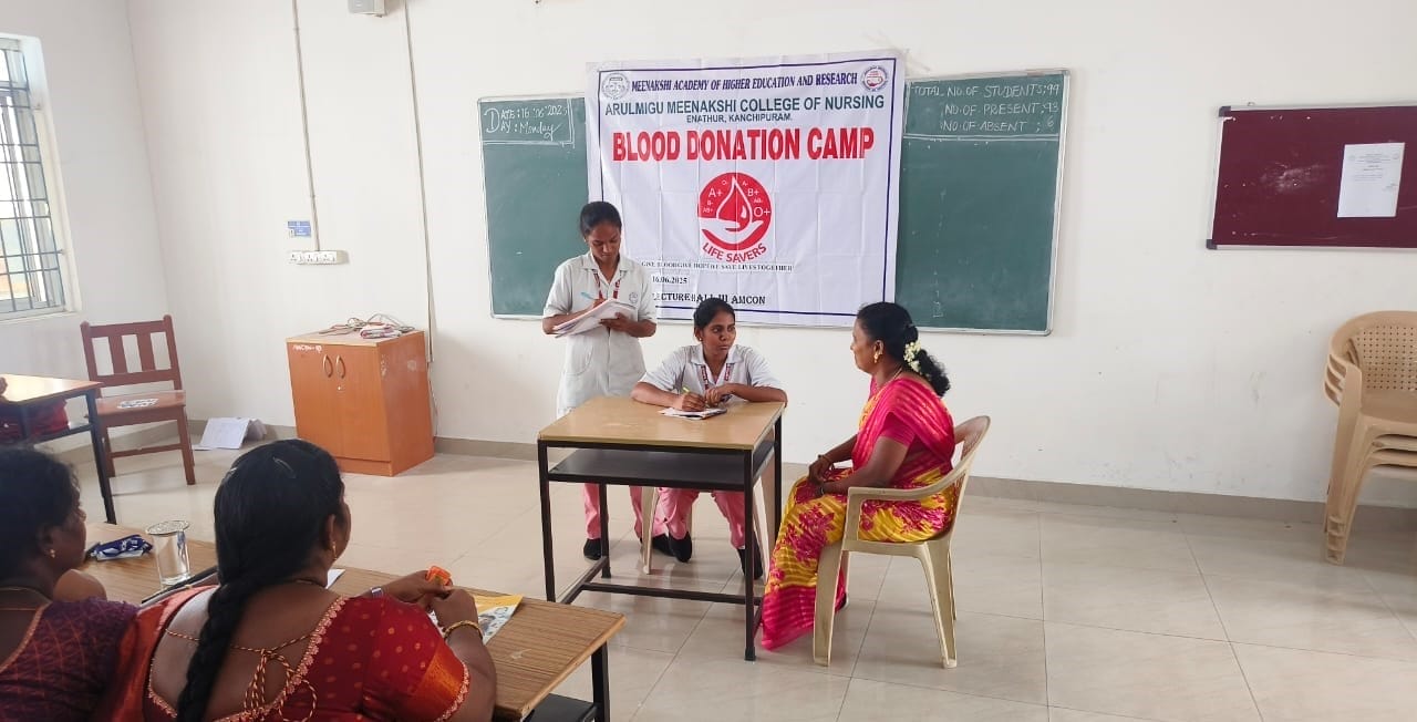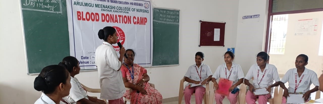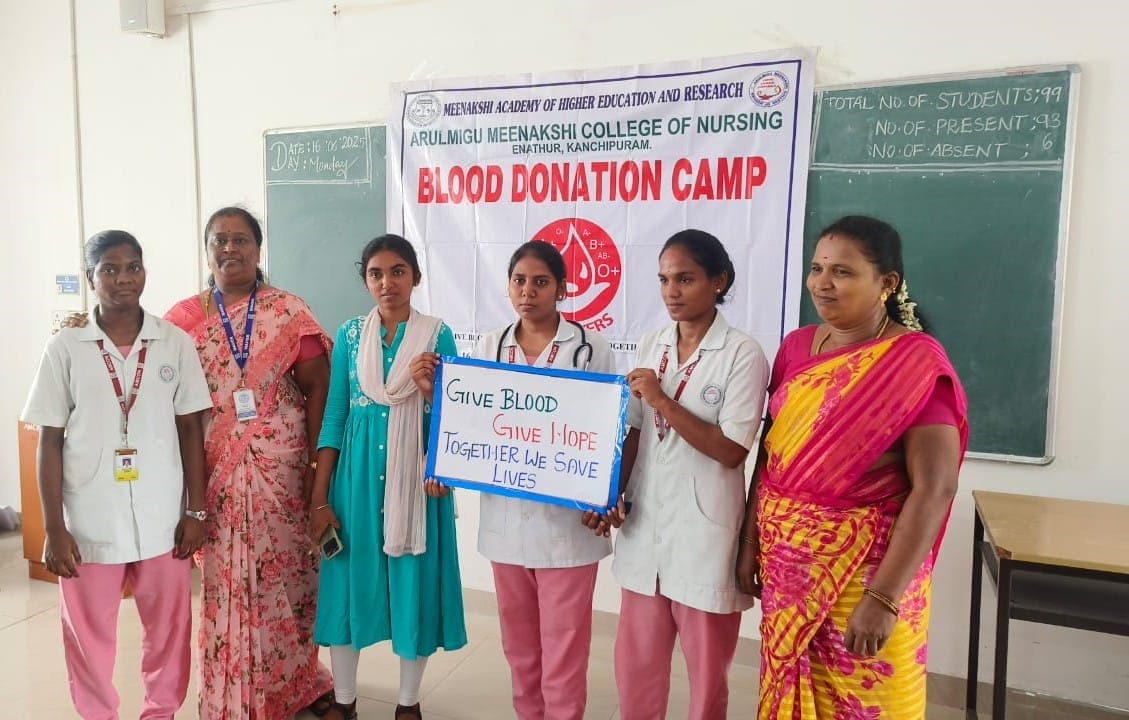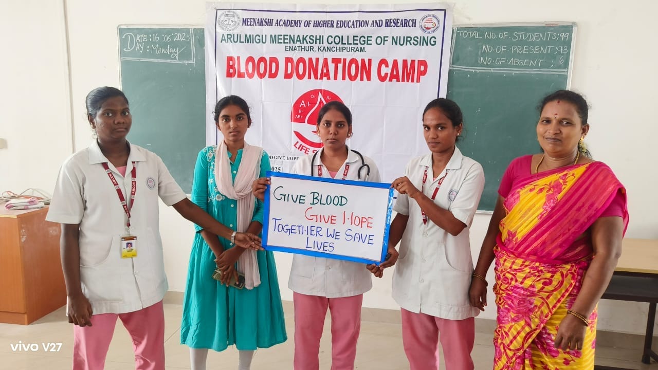 Arulmigu Meenakshi College of Nursing commemorated World Blood Donor Day on 16th June 2025, in alignment with the global theme: “Give Blood, Give Hope: Together We Save Lives.” The event aimed to raise awareness about the critical importance of voluntary blood donation and its impact on saving lives and promoting community well-being.