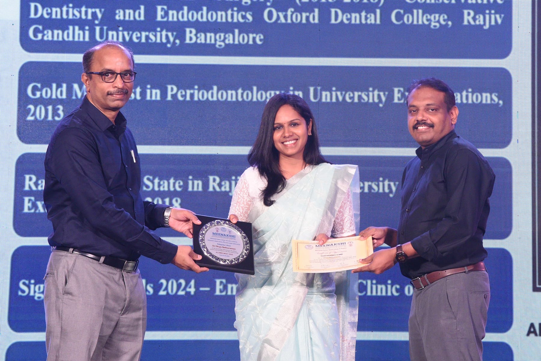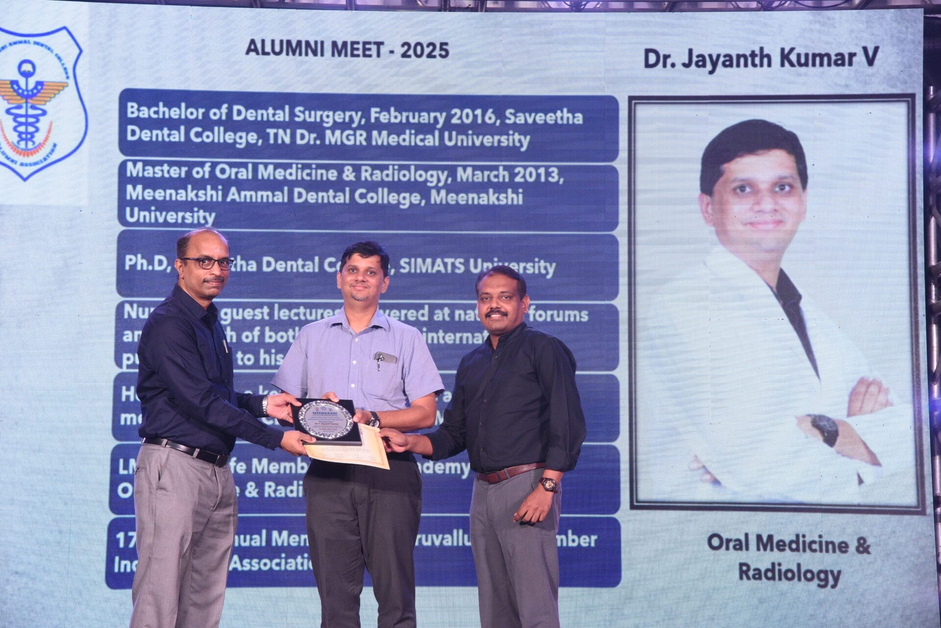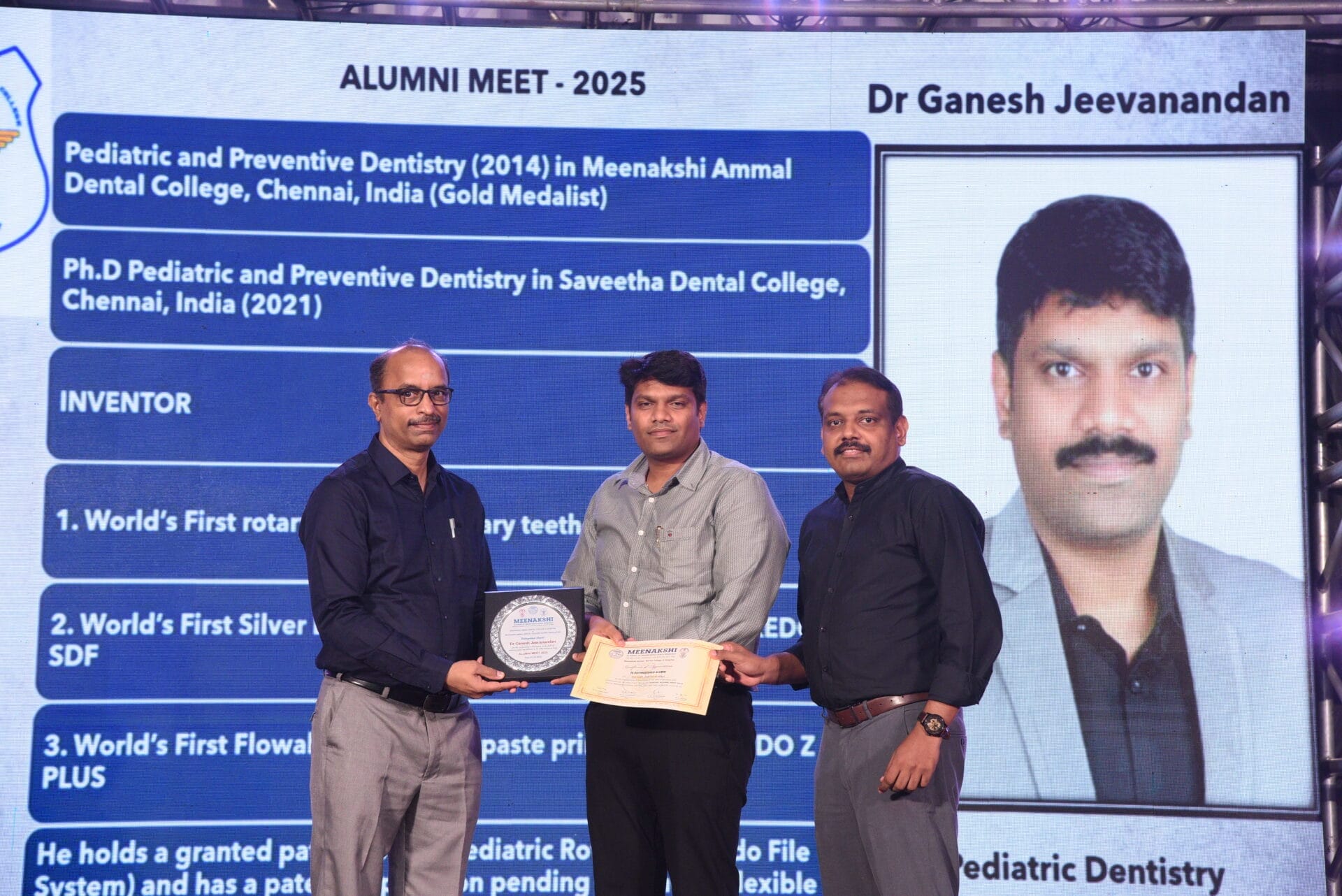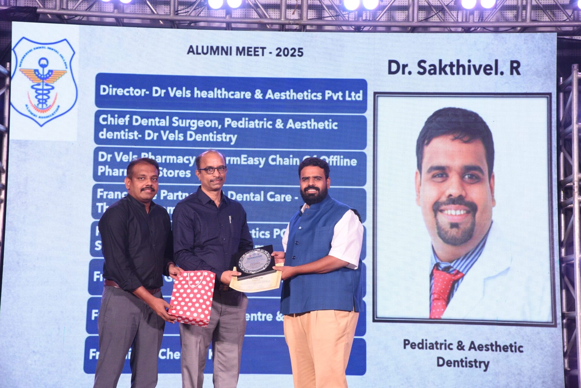 A special moment during the event was the felicitation of five accomplished alumni: Dr. Sakthivel R, Dr. Ganesh Jeevanandan, Dr. Divya Sethuraman, Dr. Jayanth Kumar, and Dr. Neeraj J Menon. These individuals were honored for their significant contributions to the field of dentistry and their continued support of the institution’s values and vision.