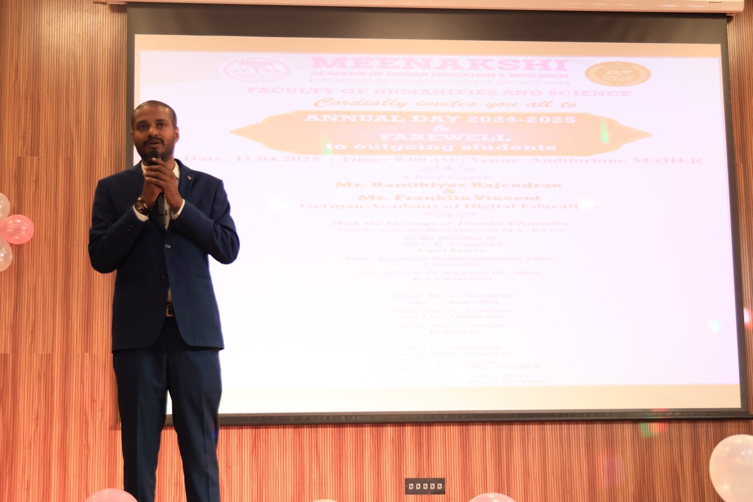 The Faculty of Humanities and Science, MAHER, marked its Annual Day 2025 and Farewell Celebration with grandeur and enthusiasm on April 11, 2025. The event commenced with Tamizh Thai Vazhthu, followed by the traditional lighting of the Kuthuvilakku and a floral tribute to the revered Founder, Thiru A.N. Radhakrishnan.