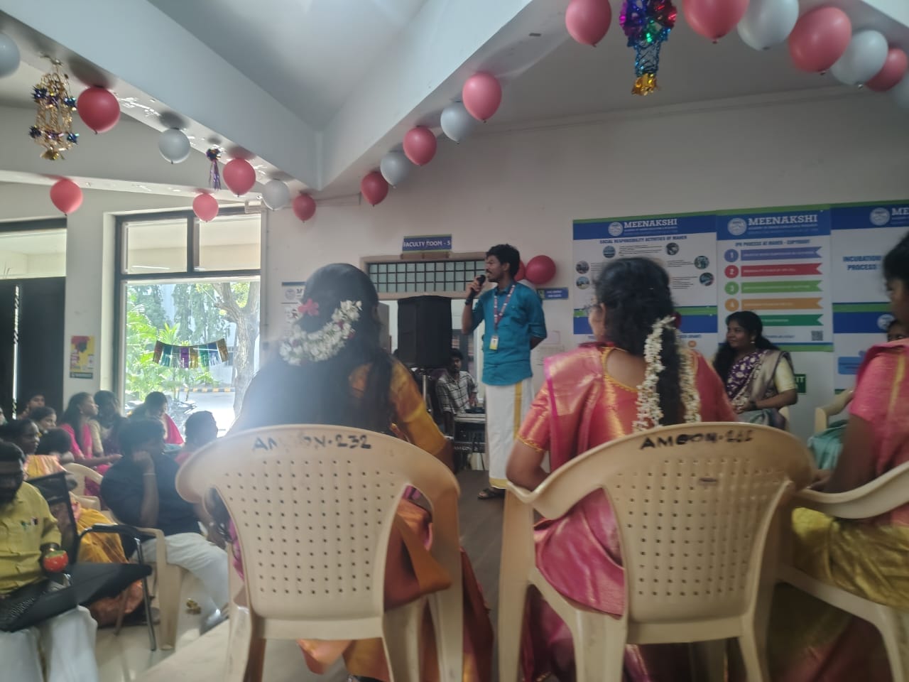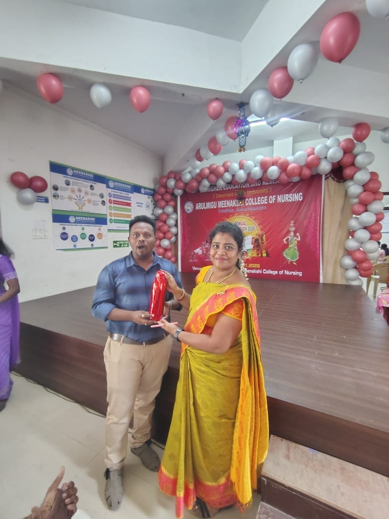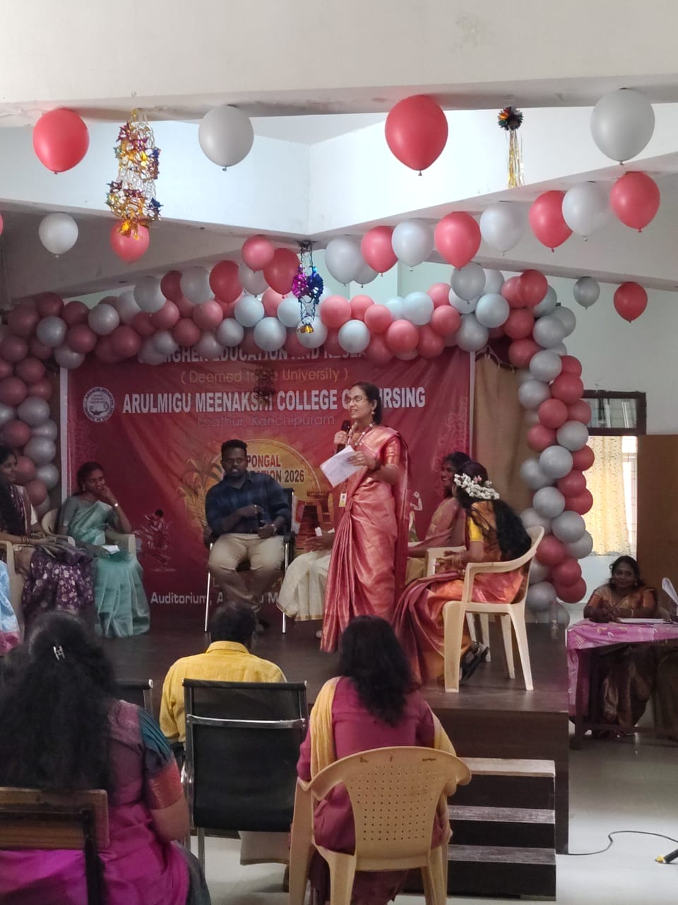 The Culturals Committee of Arulmigu Meenakshi College of Nursing organized a vibrant Pongal Celebration on 14th January 2026, marked by great enthusiasm, traditional fervour, and active student participation. The programme commenced with a lively Pongal Making Competition, symbolizing prosperity and the auspicious spirit of the harvest festival. The gathering was warmly welcomed by Ms. V. Pavithra of V Semester, who set the tone for a day filled with cultural joy and togetherness.