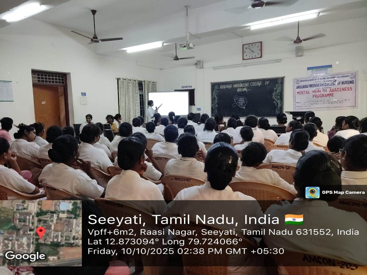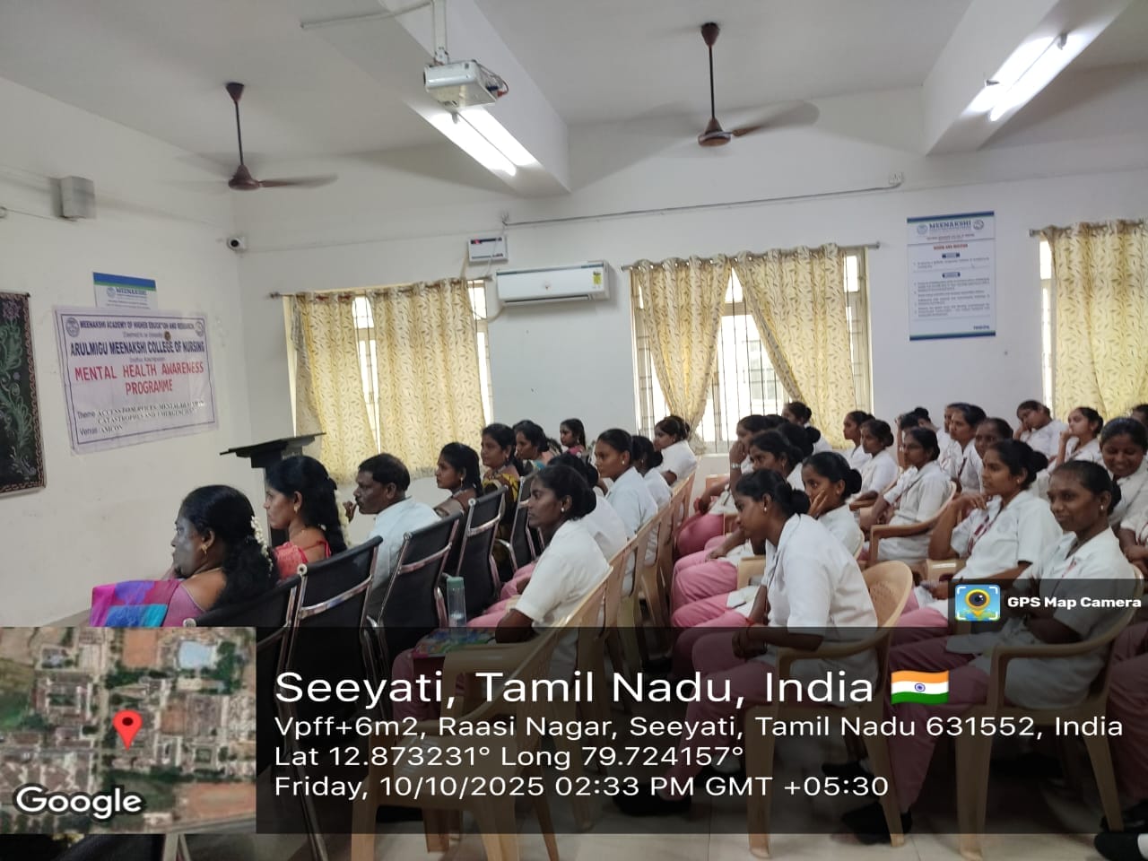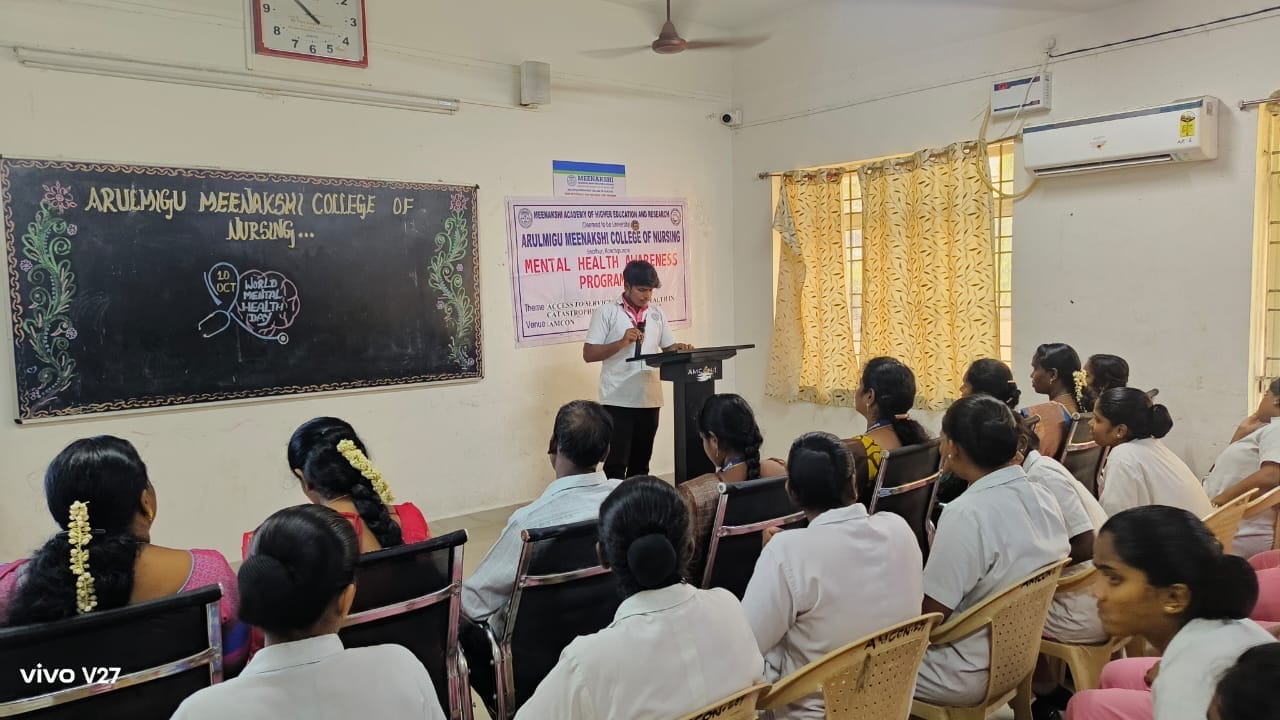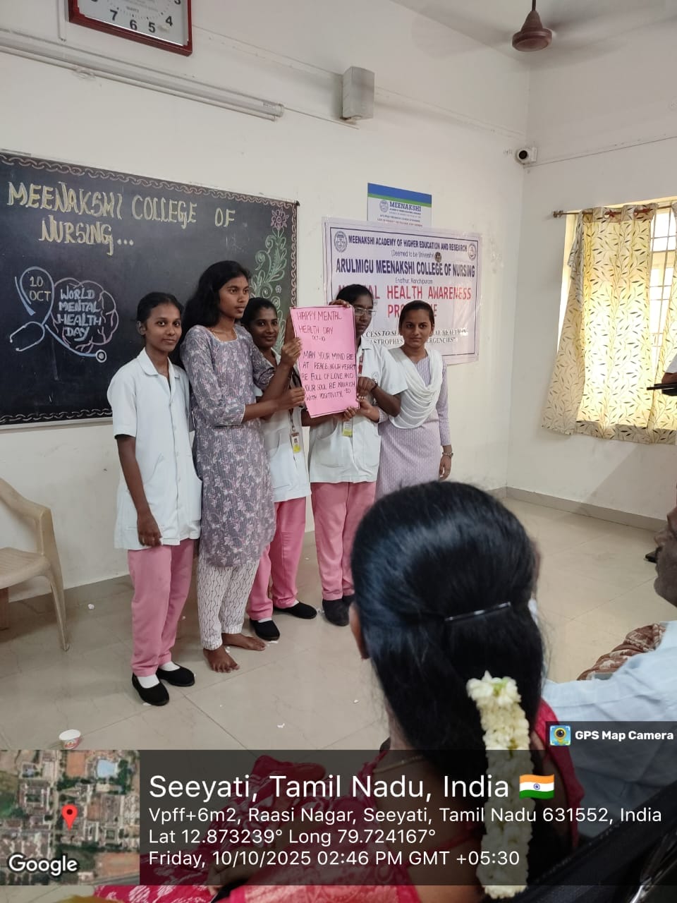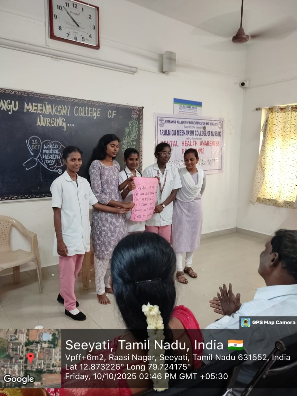 Arulmigu Meenakshi College of Nursing (AMCON) celebrated World Mental Health Day on 10th October 2025 with enthusiasm and dedication. The programme was organized by the B.Sc. (N) VII Semester students in collaboration with faculty members, aiming to raise awareness about mental health and the importance of timely access to services, especially during crises.