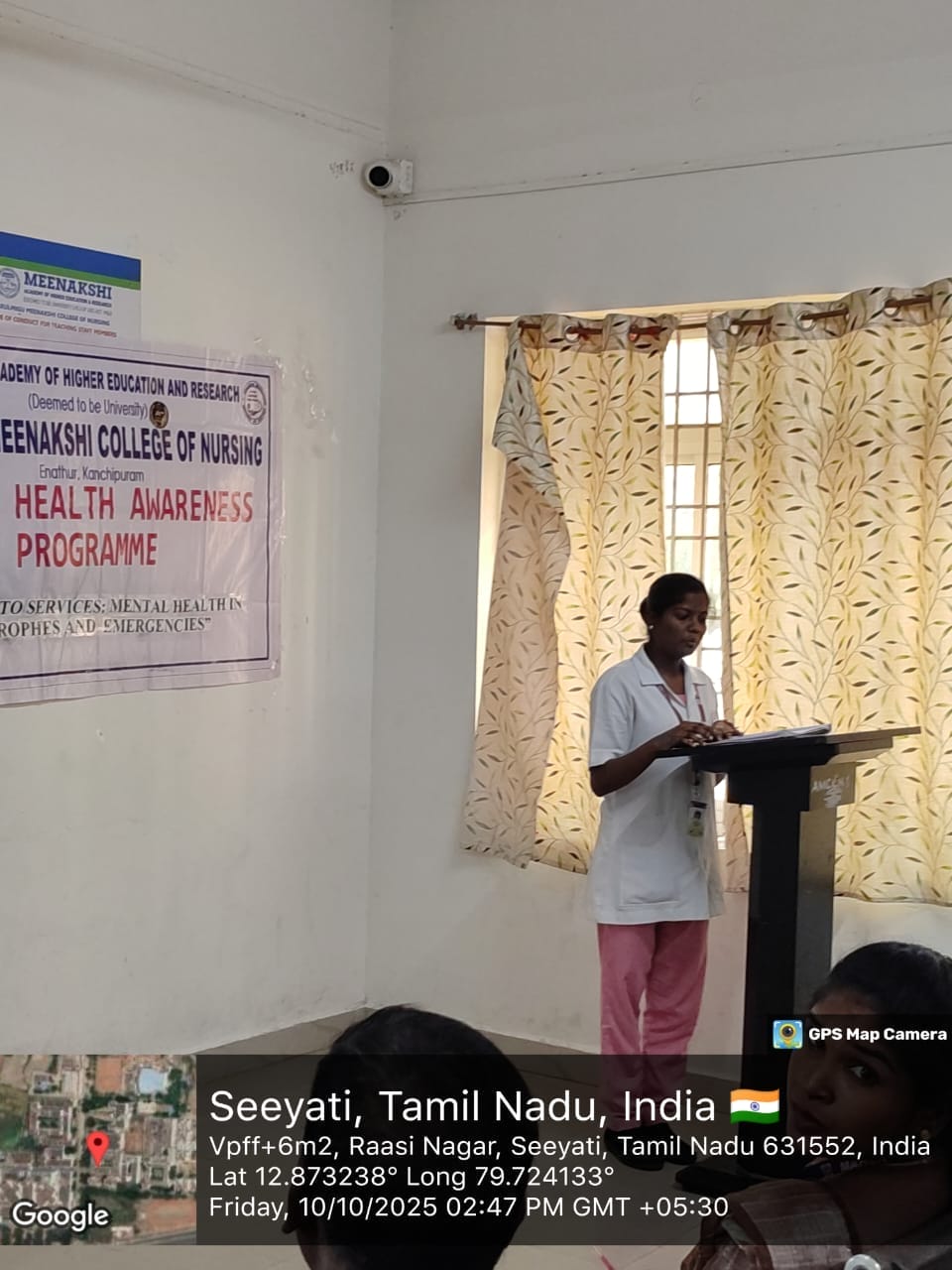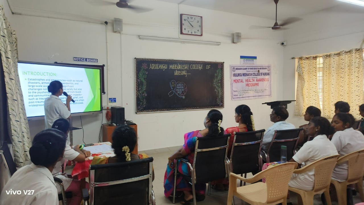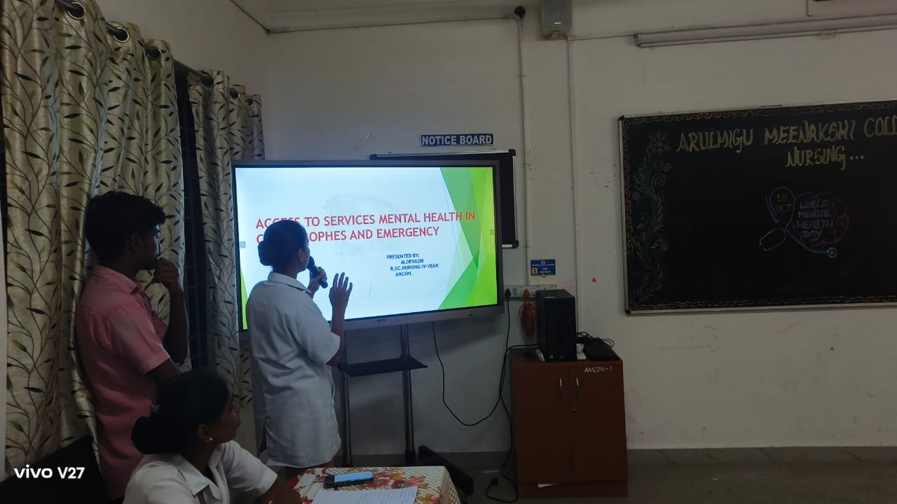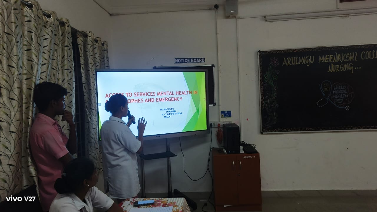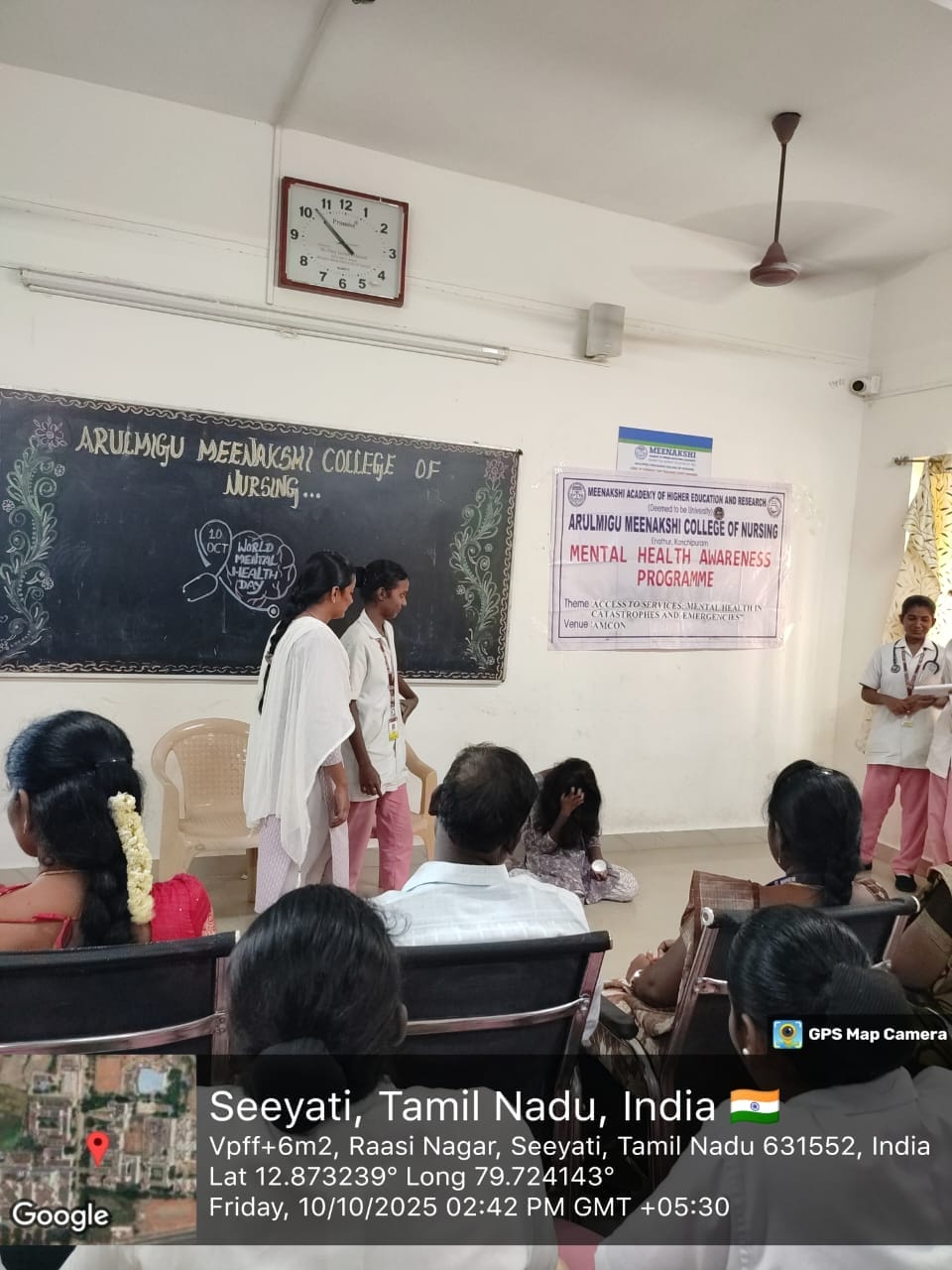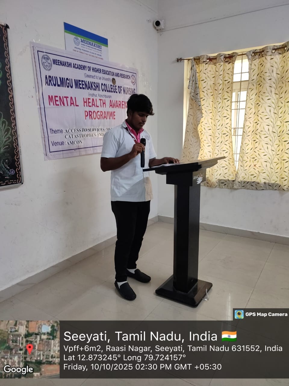 Arulmigu Meenakshi College of Nursing (AMCON) celebrated World Mental Health Day on 10th October 2025 with enthusiasm and dedication. The programme was organized by the B.Sc. (N) VII Semester students in collaboration with faculty members, aiming to raise awareness about mental health and the importance of timely access to services, especially during crises.