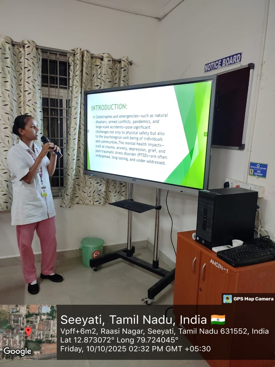 The event commenced with a warm welcome address by Ms. P. Pooja, B.Sc. (N) VII Semester. Dr. Victor Devasirvadham, Principal, AMCON, highlighted the year’s theme, “Access to Services: Mental Health in Catastrophes and Emergencies.” Mr. Sugapriyan, B.Sc. (N) VII Semester, delivered a speech on the significance of World Mental Health Day, followed by a PowerPoint presentation on the theme by Ms. M. Devasri, B.Sc. (N) VII Semester.