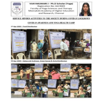 Ms.J.Vijaya Kumari, PhD Scholar under the guidance of Professor and Head Dr.R.Elangovan has done extended activities to the public during the covid Pandemic. Vijaya Kumari distributed fruits, green leafy vegetables,