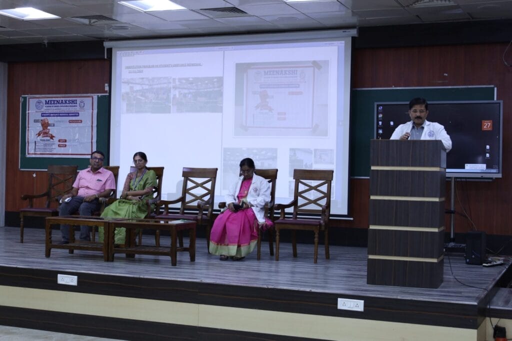 Student Grievance Redressal Committee of Meenakshi Medical College Hospital & Research Institute organized an awareness programme for 2nd year 2023-2024 Batch on Students Grievance Redressal. The programme was designed to educate students about the SGRC’s purpose, functions, and how to utilize its services. Dr. R. Jayanthi, Co-ordinator of the Students Grievances Redressal Committee, delivered the welcome address. Prof. Dr. K.V. Rajasekhar, Dean, delivered the inaugural address, officially commencing the programme and emphasizing the importance of addressing student grievances. Dr. Muthubabu, committee member, discussed an overview of the Students Grievances Redressal Committee including Purpose and functions of the SGRC and Types of grievances handled by the SGRC. A dedicated segment facilitated open discussion among students on topics related to grievances, concerns, and the SGRC. This allowed students to share their perspectives and experiences. Dr. Betty delivered the vote of thanks, expressing gratitude to all speakers, attendees, and organizers for their participation in the programme.