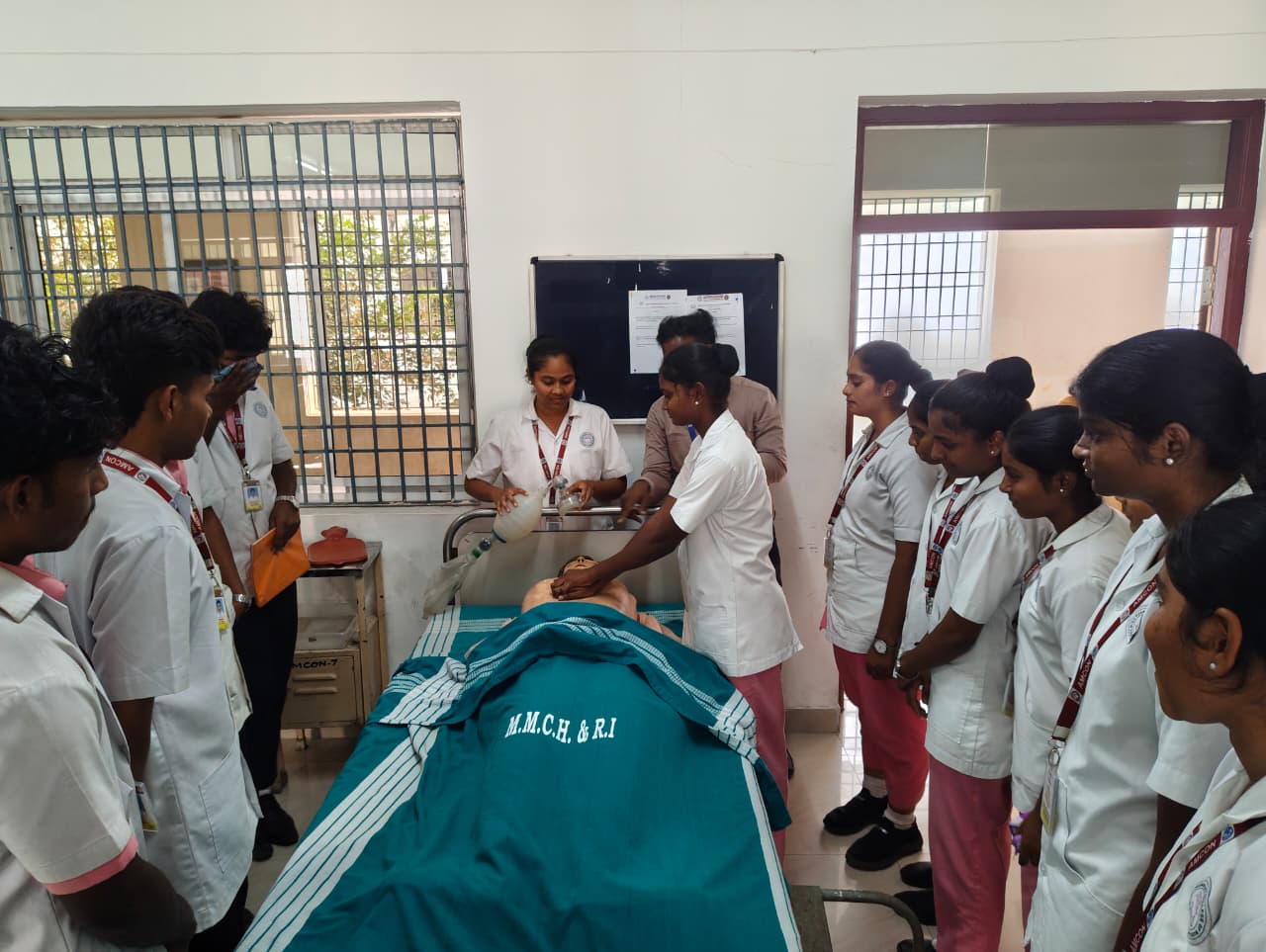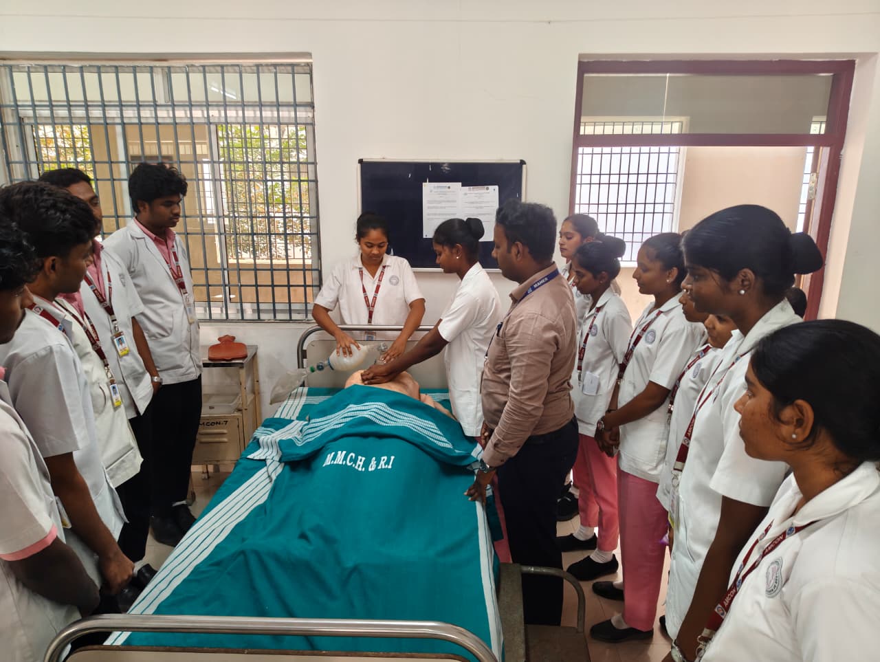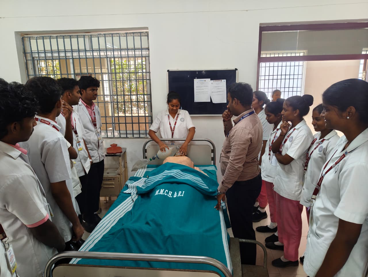 The morning theory session was delivered by Prof. Kanchana, Vice Principal, Sankar College of Nursing, Kanchipuram. The practical skill stations were conducted by Mr. E. Prasanna Kumar, BCLS Instructor (IRCF) and Simulation Instructor (HSSC).