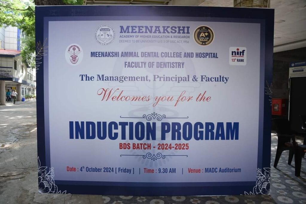 The 1st BDS induction program for the year 2024-25 was held on 4th October at Meenakshi Ammal Dental College. The students and parents were addressed by vice chancellor, pro vice chancellor, Registrar, Principal , Vice principals, and Heads of various departments.