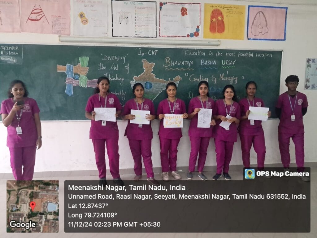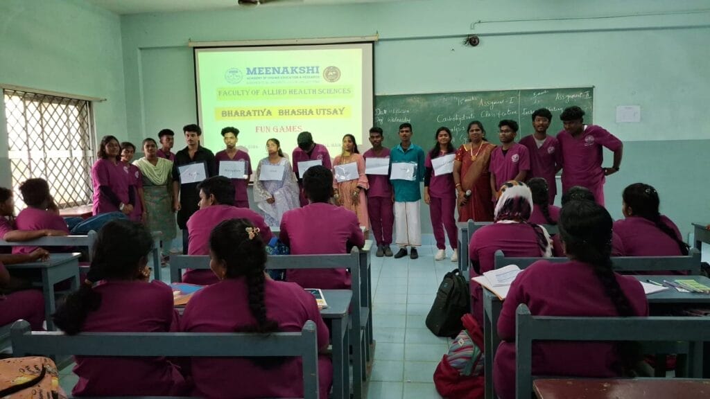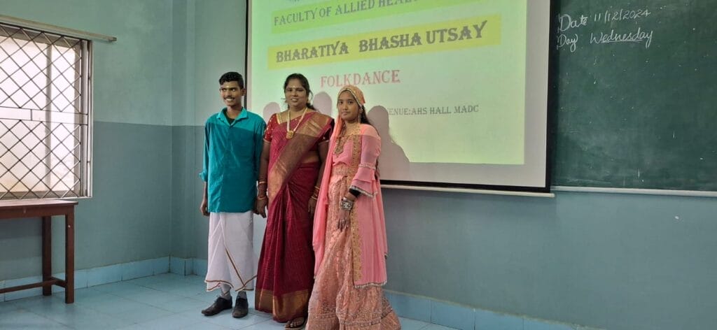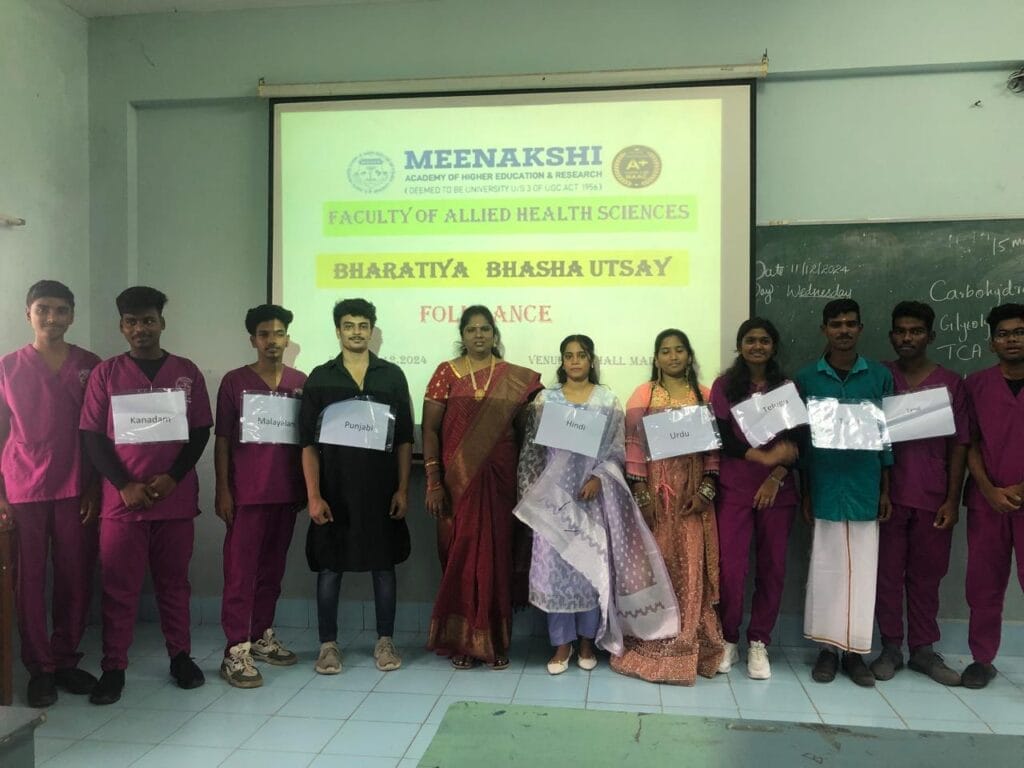 The Faculty of Allied Health Sciences, MAHER, celebrated “Bharathiya Basha Utsav” on December 11, 2024, with the active participation of 240 students. The event emphasized India’s linguistic and cultural diversity through activities like regional language learning and vibrant folk dance performances, fostering unity in diversity.