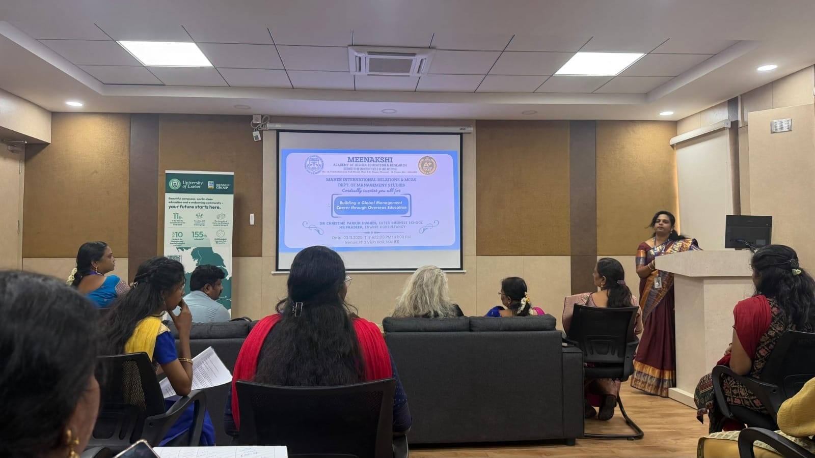 The Department of Management Studies, Meenakshi College of Arts and Science, in collaboration with International Relations, MAHER, organized an insightful guest lecture on 3rd November 2025 for first-year MBA and BBA students at the PhD Viva Voce Hall.