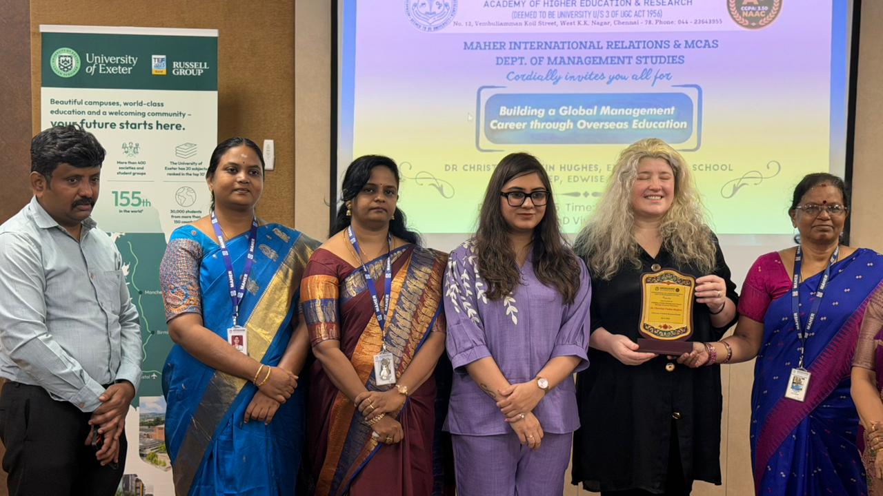 The session was led by Dr. Christine Parkin Hughes from the University of Exeter Business School, along with Mr. Pradeep from Edwise Consultancy. They shared valuable insights on global career building, leadership, communication, and time management, motivating students to excel academically and professionally.