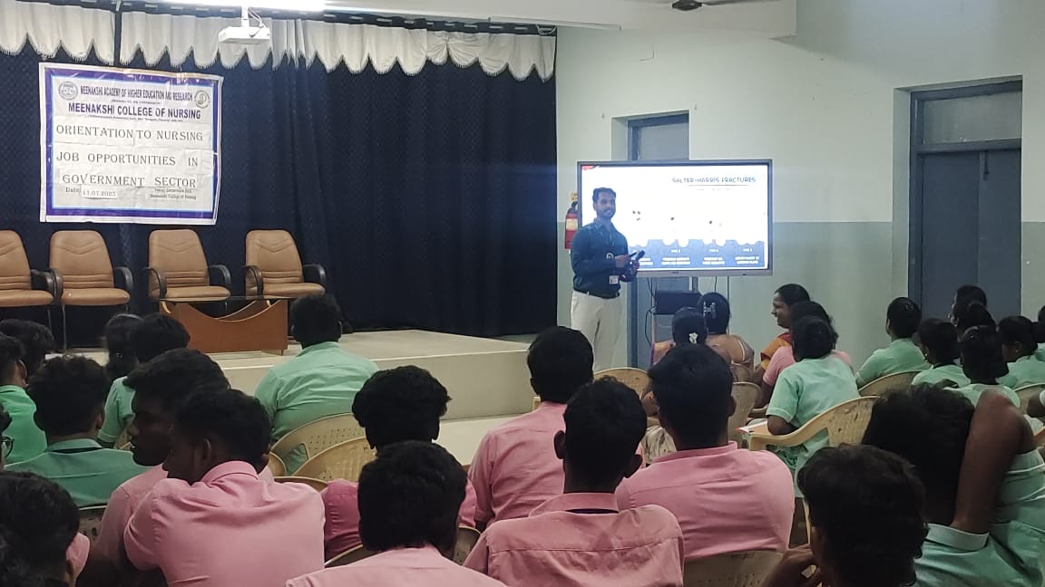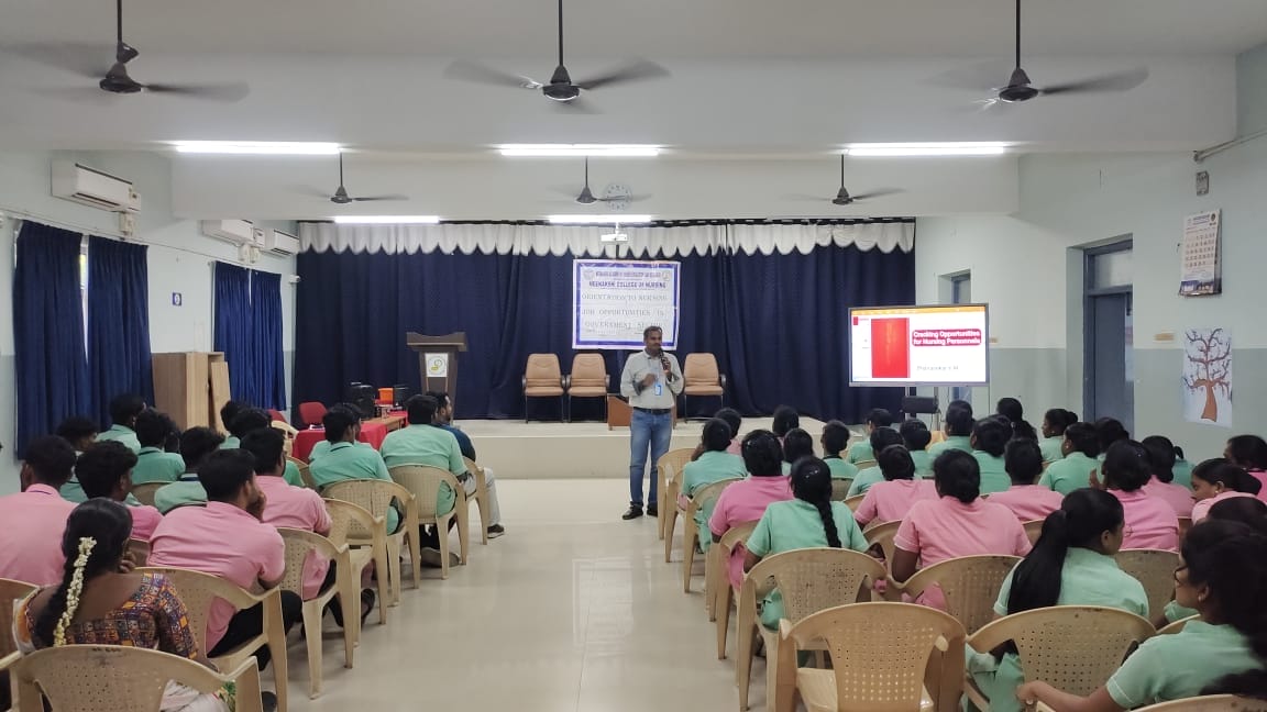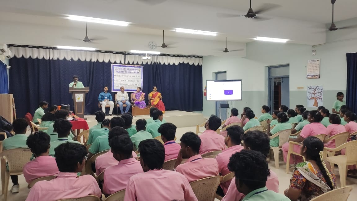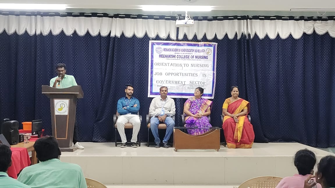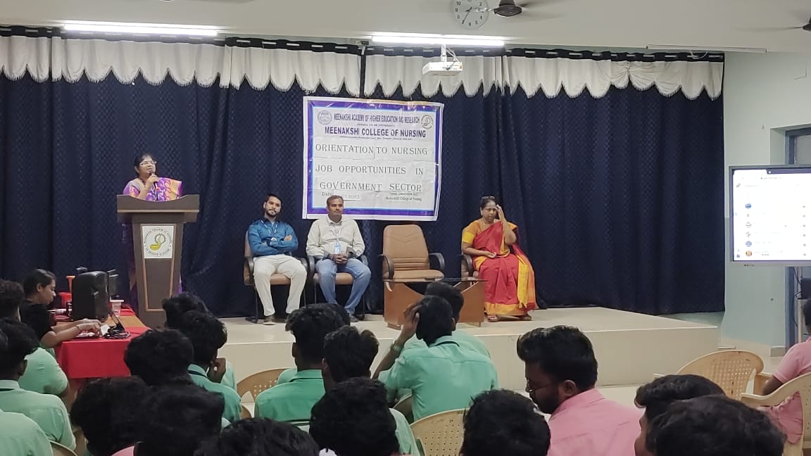 The Training, Placement, and Career Guidance (TPCG) Committee of Meenakshi College of Nursing (MCON) organized a highly informative Career Guidance Program titled “Orientation to Nursing Job Opportunities in Government Sector” on 11th July 2025. The session, held from 2:00 PM to 3:00 PM, was designed exclusively for B.Sc Nursing III and IV year students to enhance their awareness of career pathways in the public sector.