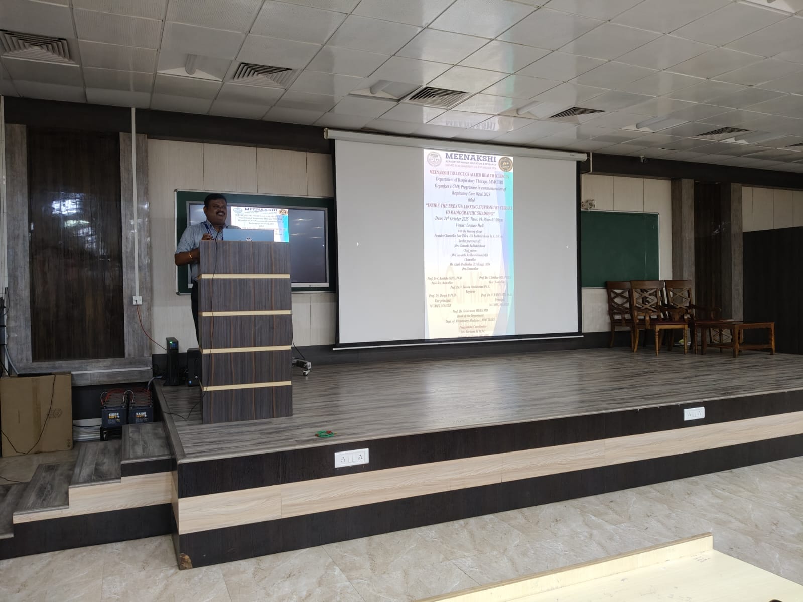 The Department of Respiratory Therapy, Meenakshi College of Allied Health Sciences (MCAHS), MAHER, organized a Continuing Medical Education (CME) programme on 24th October 2025 as part of the Respiratory Care Week celebration. The event, themed “Inside the Breath: Linking Spirometry Curves to Radiographic Shadows,” aimed to enhance interdisciplinary understanding between radiological imaging and pulmonary diagnostics in respiratory care.