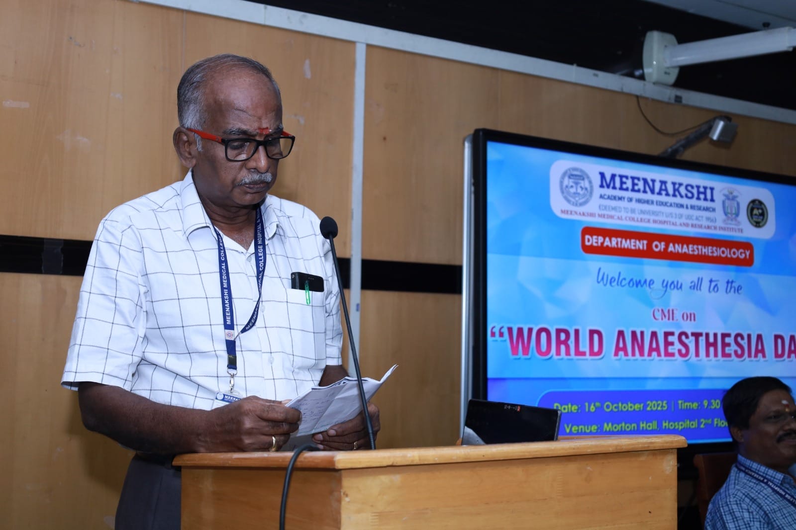 The Department of Anaesthesiology, Meenakshi Medical College Hospital & Research Institute (MMCHRI), Enathur, Kanchipuram, conducted a Continuing Medical Education (CME) programme on World Anaesthesia Day on 16 October 2025 at Morton Hall. The event celebrated the vital contributions of anaesthesiologists to modern healthcare while enhancing awareness of contemporary anaesthesia practices.