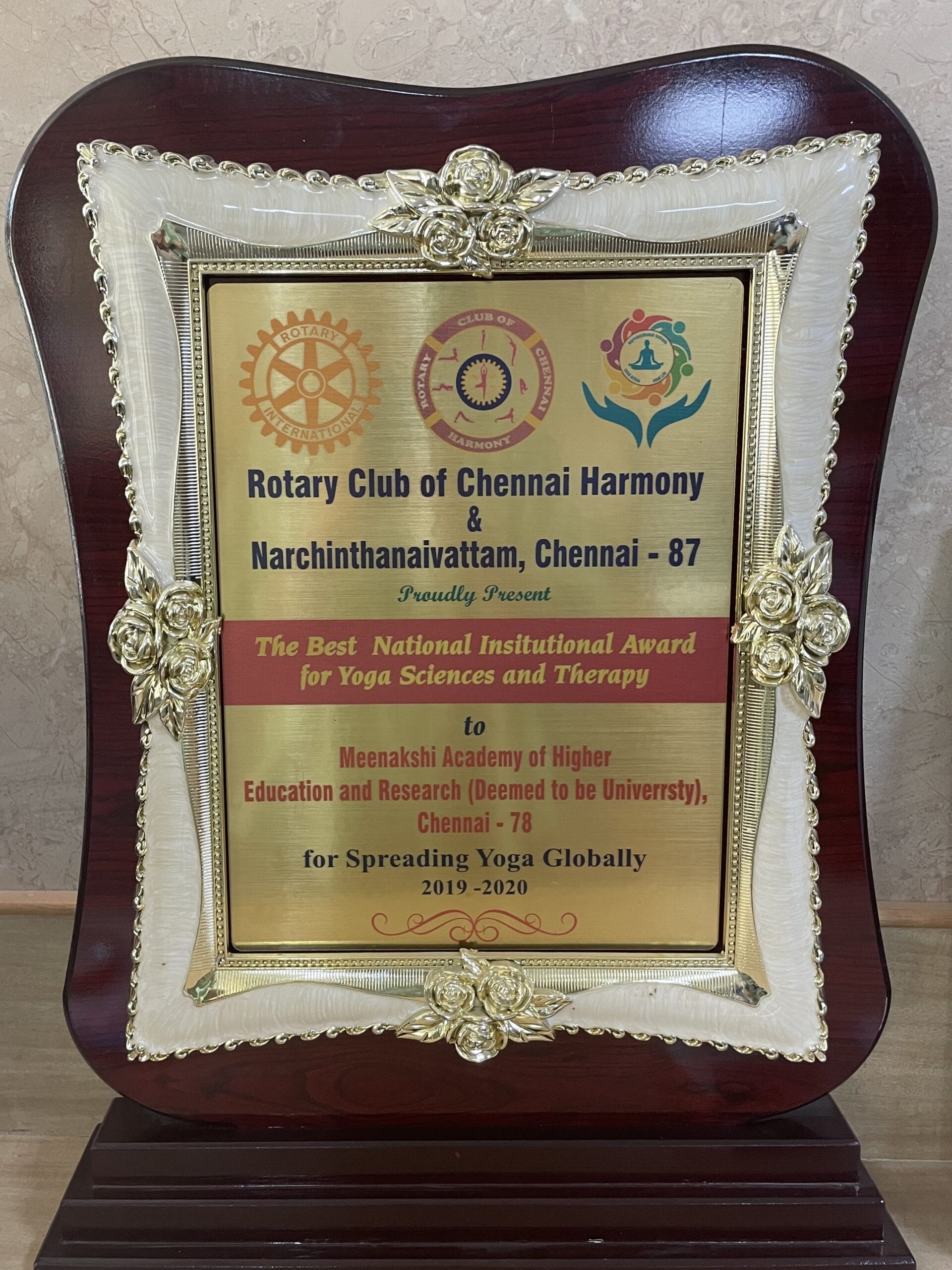 | 10 | Best National Institutional Award for Yoga Sciences and Therapy | Rotary Club of Chennai Harmony | Meenakshi Academy of Higher Education and Research |