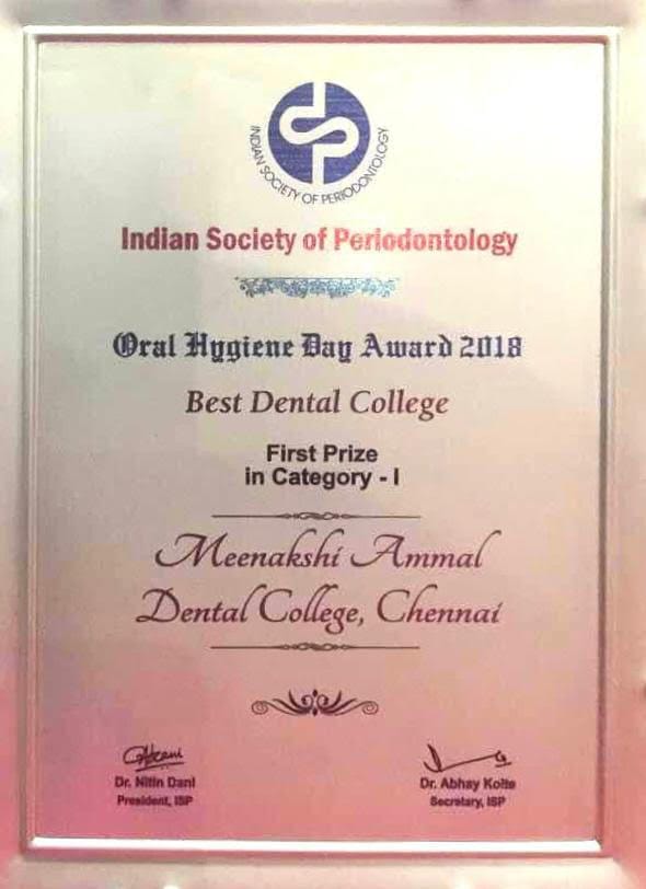 | 11 | Oral Hygiene Day Award – Best Dental College | Indian Society of Periodontology | Meenakshi Ammal Dental College |