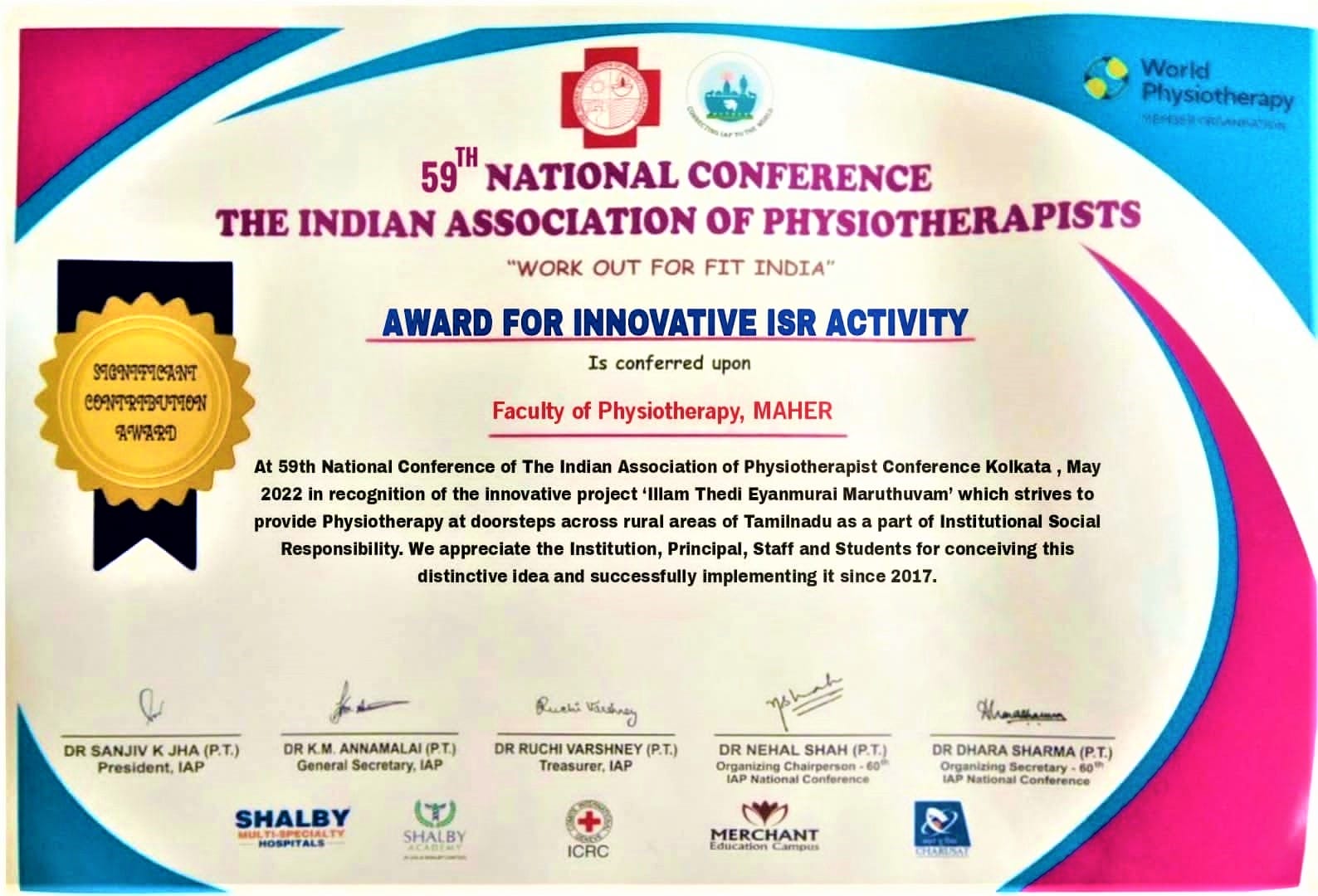 | 2 | Award for Innovative ISR Activity | The Indian Association of Physiotherapists | Faculty of Physiotherapy |