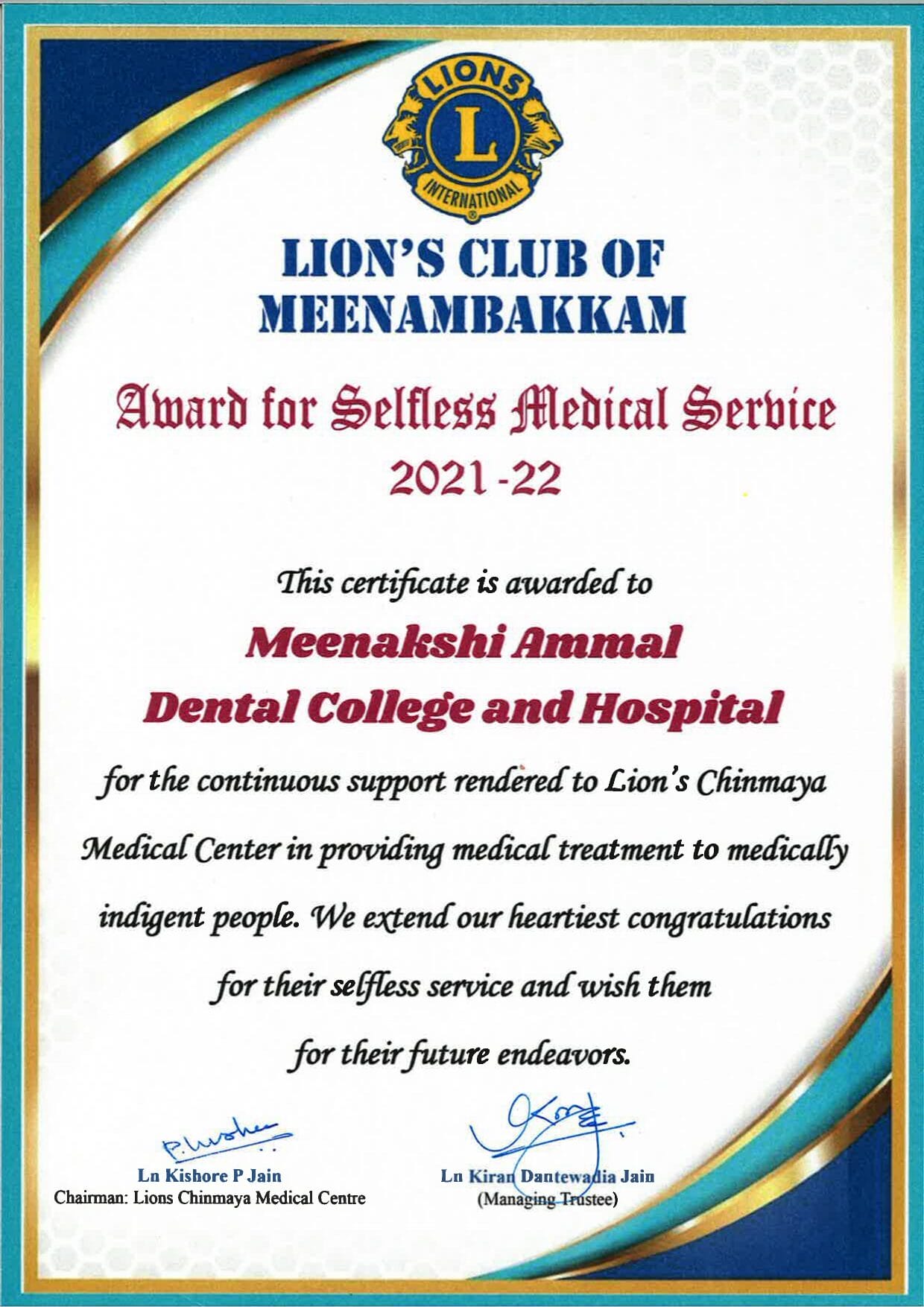 | 3 | Award for Selfless Medical Service | Lion’s Club of Meenambakkam | Meenakshi Ammal Dental College |