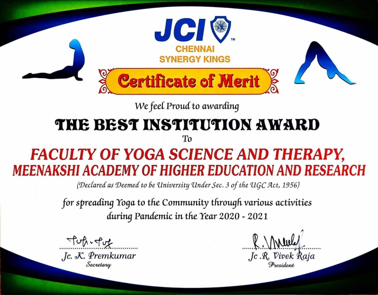 | 7 | Best Institution Award for Yoga Sciences and Therapy | JCI, Chennai | Faculty of Yoga Science and Therapy |