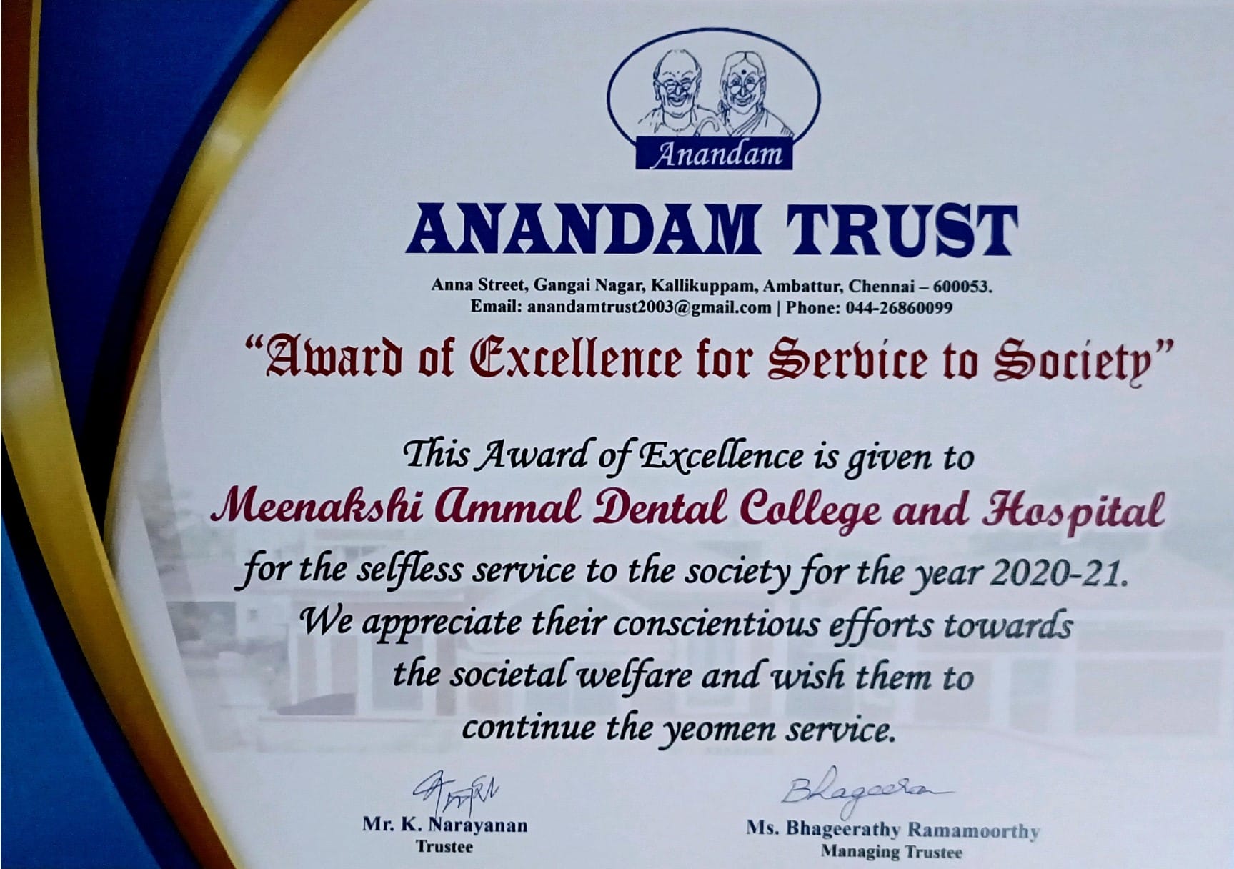 | 8 | Award of Excellence for Service to Society | Anandam Trust, Ambattur, Chennai | Meenakshi Ammal Dental College |