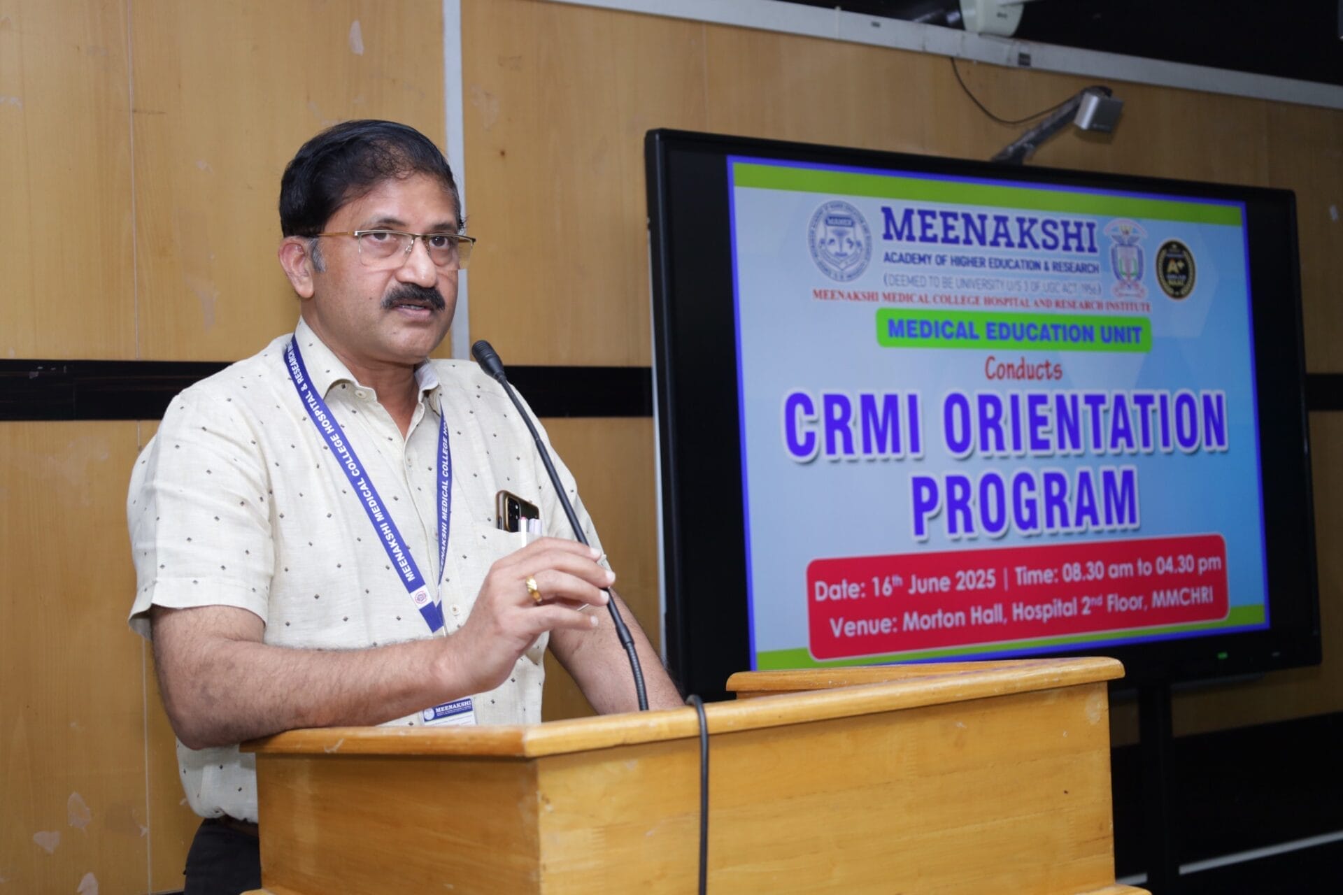 The Medical Education Unit and Mentorship Committee of Meenakshi Medical College Hospital & Research Institute (MMCHRI) conducted the CRMI Orientation Programme on 16th June 2025. The programme was designed to sensitize and prepare the new batch of Compulsory Rotating Medical Interns (CRMI) by familiarizing them with the academic, ethical, administrative, and practical dimensions of their internship training.