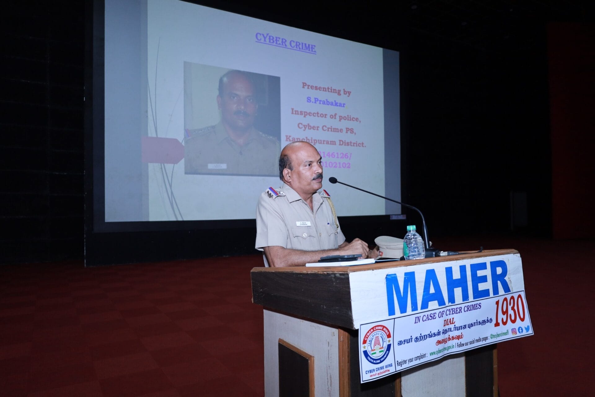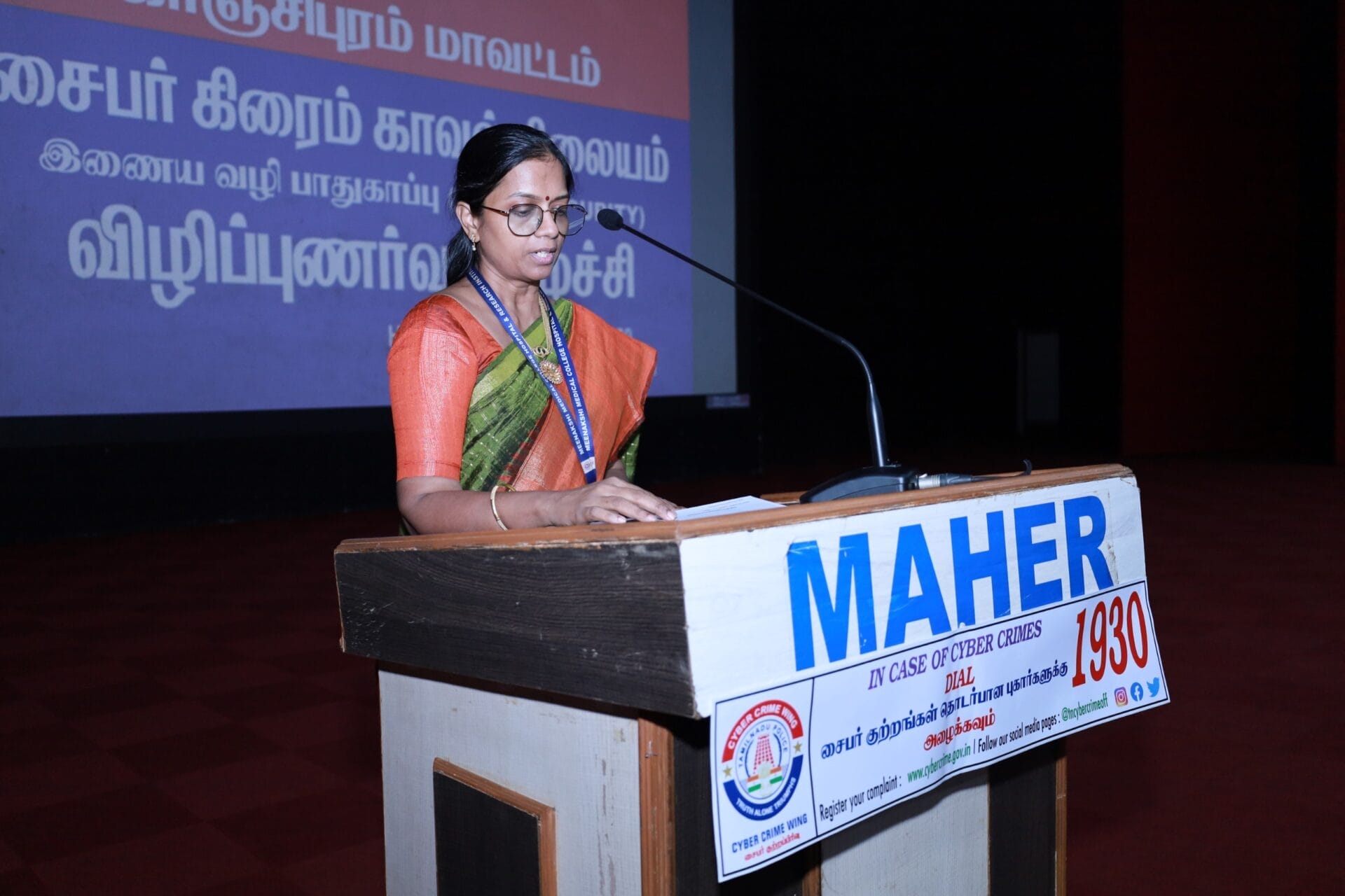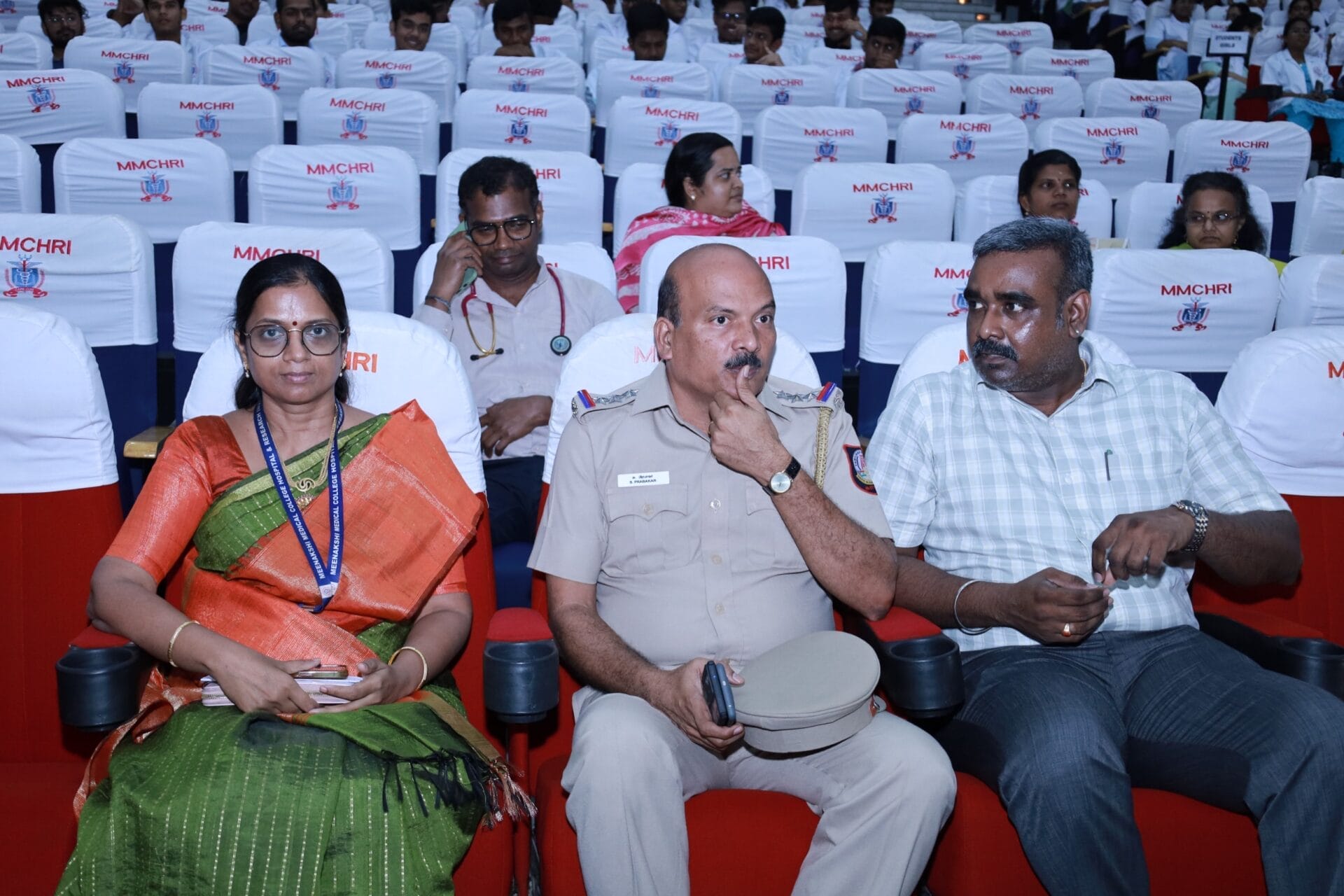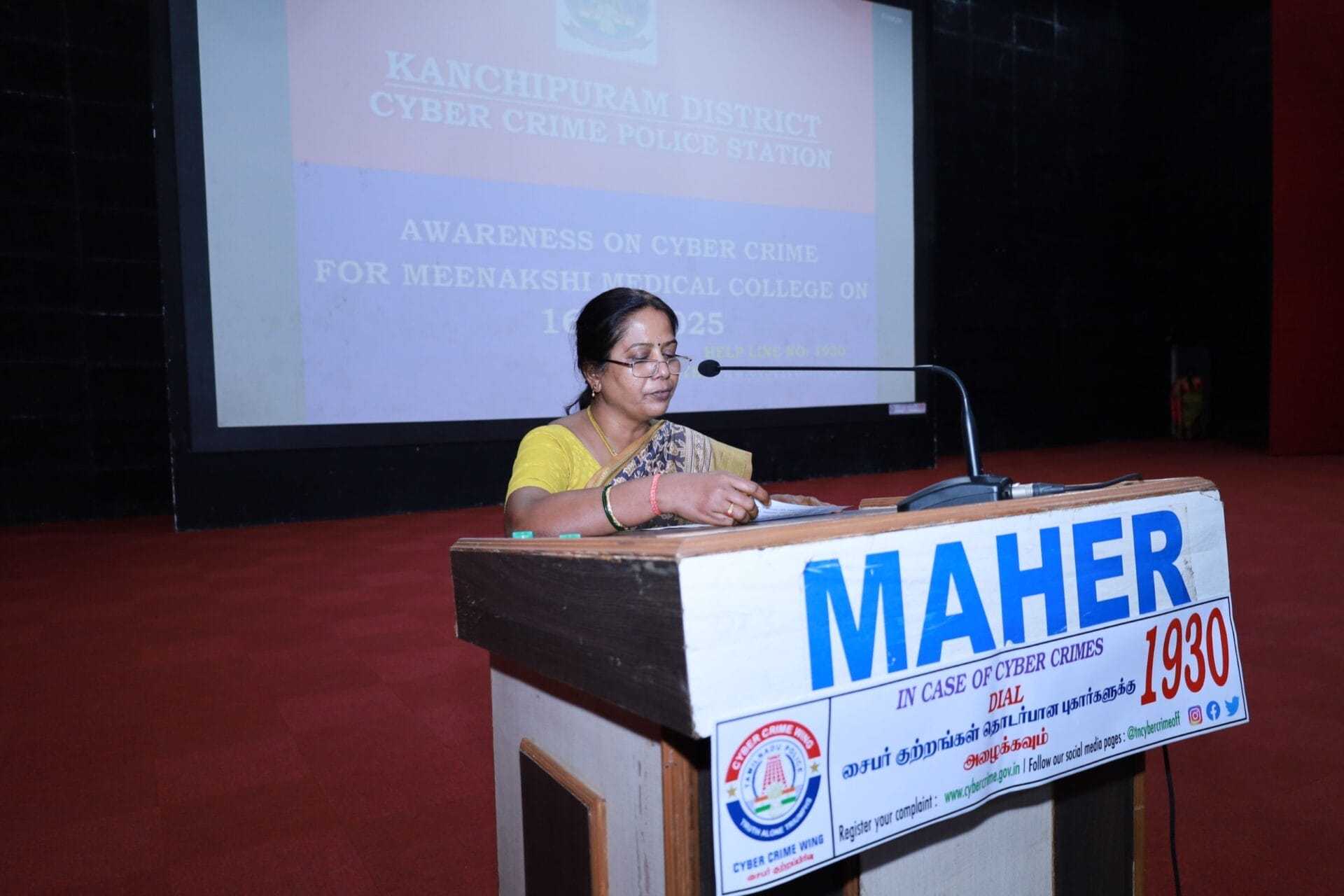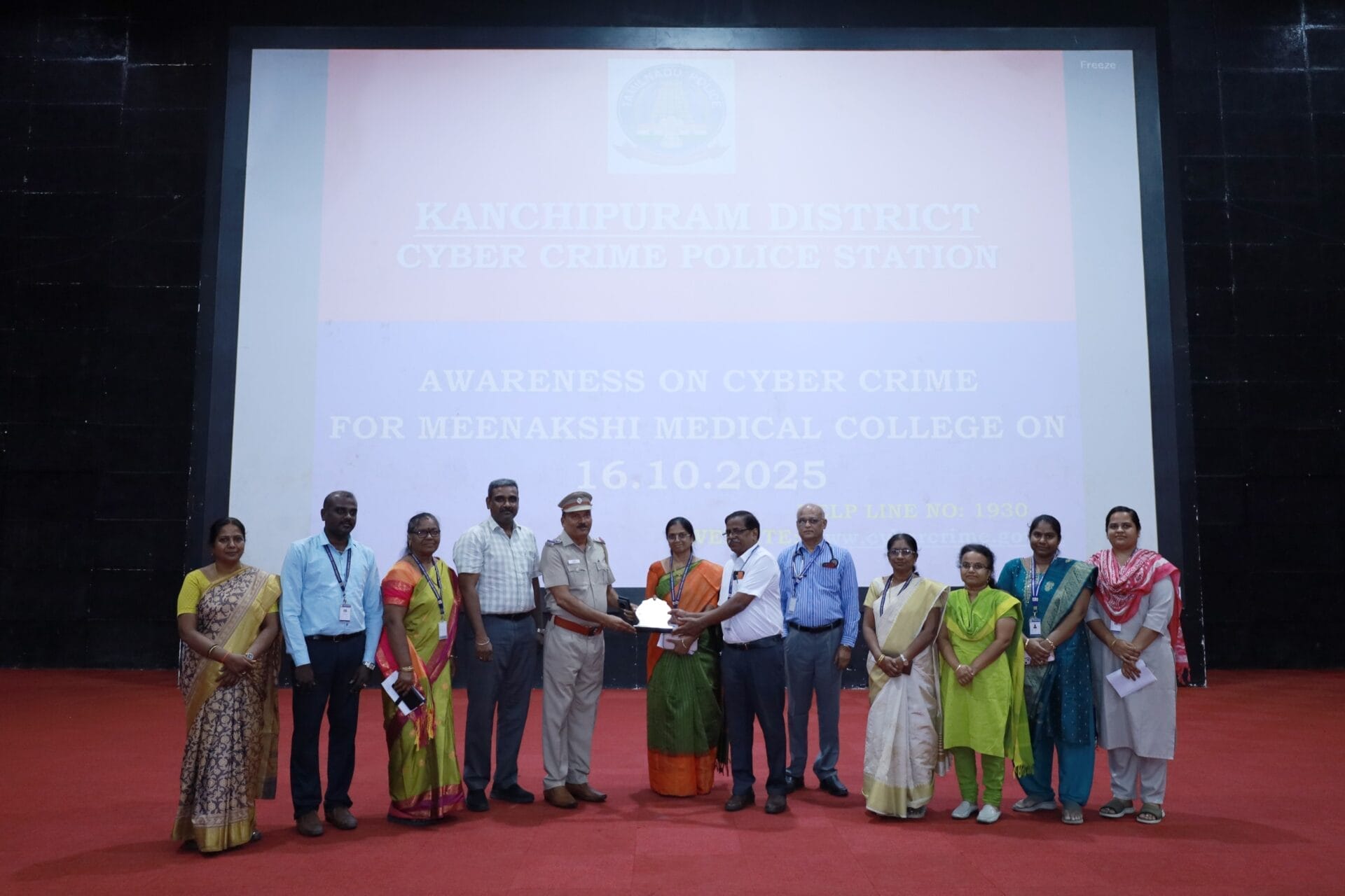 A Cyber Crime Awareness Program was organized on 16th October 2025 at the Auditorium of Meenakshi Medical College Hospital and Research Institute, Kanchipuram, from 11:00 AM to 1:00 PM. The session was conducted by Inspector S. Prabakar, Cyber Crime Police Station, Kanchipuram.