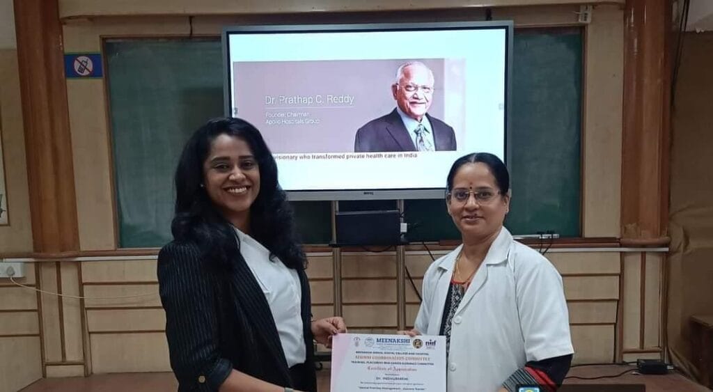 Meenakshi Ammal Dental College Alumni Coordination Committee along with Training, Placement and Career Guidance Committee organized a program on “Dental Practice Management – Current Trends” by Dr. Indhumathi – Regional Head , Apollo Dental [UG Alumni 2002-2007 batch] and Dr. Anshoo – Apollo Dental for CRI’s on 23/11/2024.