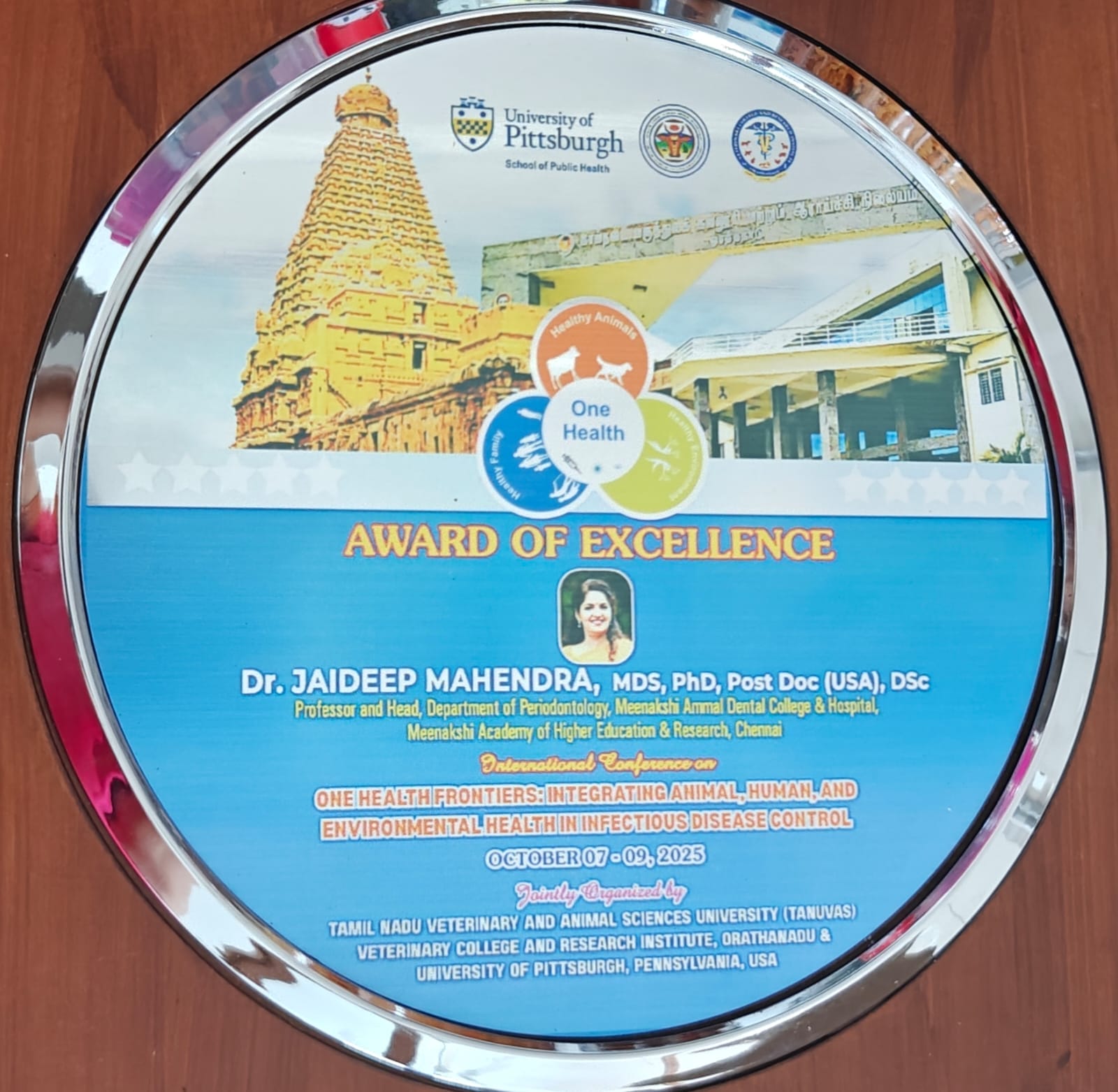 Dr. Jaideep Mahendra has been conferred with the “Award of Excellence” at the International Conference on ‘One Health Frontiers: Integrating Animal, Human, and Environmental Health and Infectious Disease Control’, organized by the Tamil Nadu Veterinary and Animal Sciences University (TANUVAS) and the Department of Veterinary Microbiology, Veterinary College and Research Institute, Orathanadu.