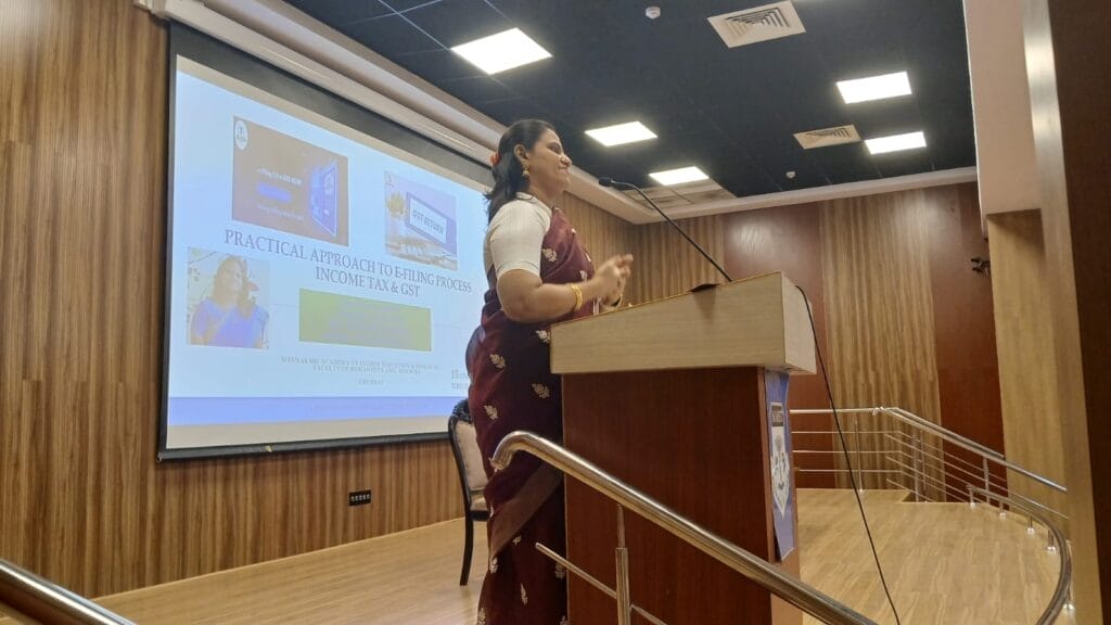 Faculty of Humanities and Science organized the Guest lecture on the topic of “E- filing and income tax” was held in MAHER Auditorium on 18.06.2024 from 10am to 12.30pm. The speaker Mrs. Kavitha Umapathy, chartered Accountant, talked about the ” E-filing and income tax ” the students gained in surplus knowledge on the various aspects of income tax. Totally 153 students participated in the program.