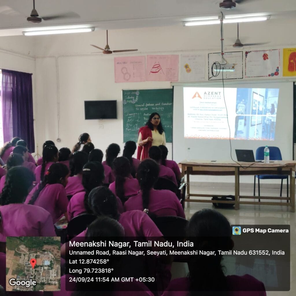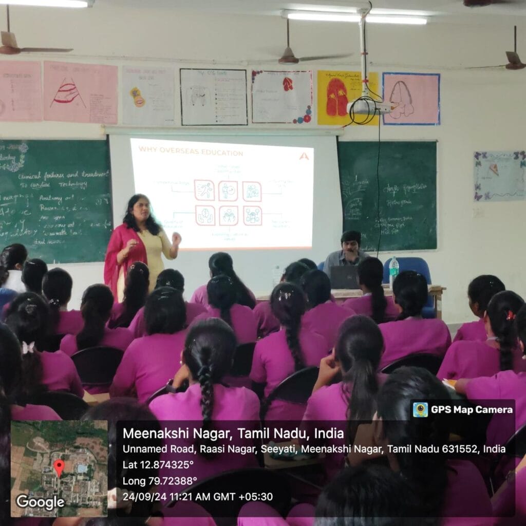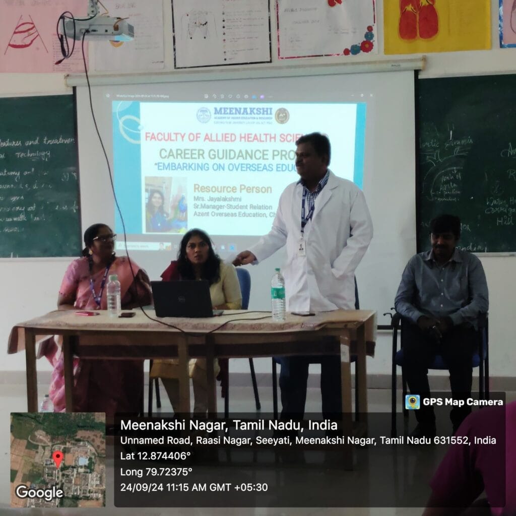 The placement cell, Faculty of Allied Health Sciences (FAHS), MAHER organized a career guidance program, “Embarking on Overseas Education” for third-year and internship students of FAHS on 24.9.2024. Mrs. Jayalakshmi, Senior Manager at Azent Overseas Education, was the guest speaker. Prof Dr. V.Ramnath, Principal, and Prof. Dr. K.S. Sridevi Sangeetha, Vice Principal, presided over the event. Over 100 students participated in the engaging session.