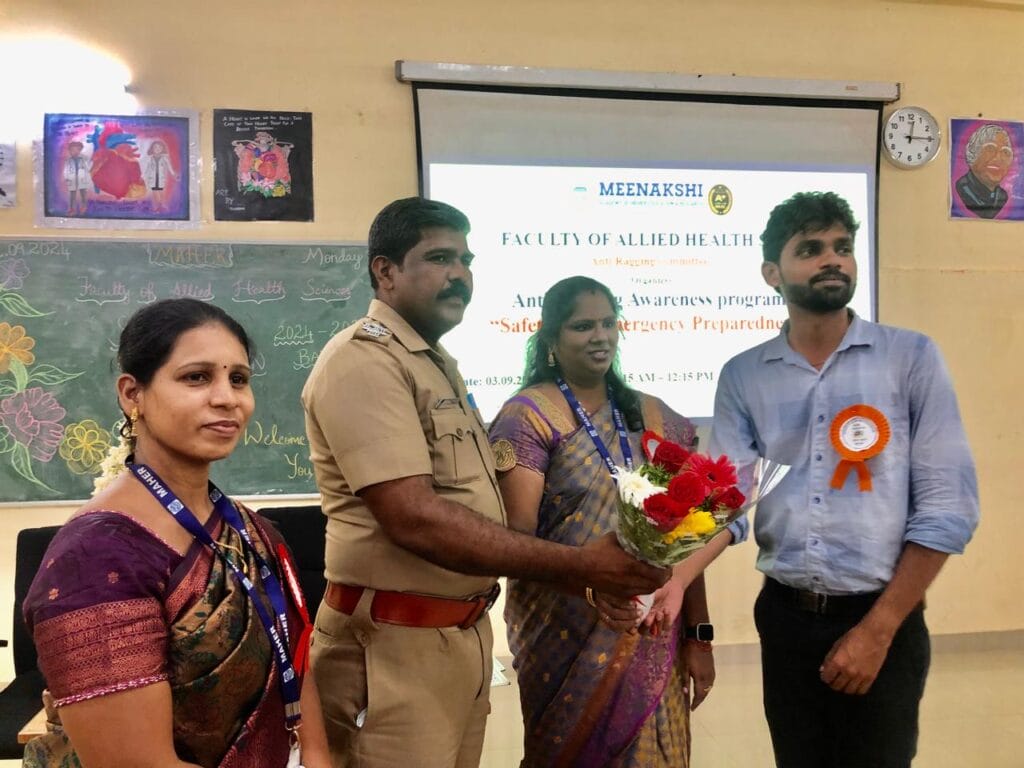 Day 2 (03.09.24): The vice principal’s Dr.K.S.Sridevi Sangeetha illuminated about Academic Overview, Dr.B.Durga expounded about Introduction to Academic Regulations and Discipline. Followed by an invited talk “A Strategic Framework for Cohesion in Healthcare system” by Dr. Saravana Kumar, Department of Anatomy MMCHRI. The various committee coordinators oriented to students about the committees like Anti-ragging, Internal Complaints Committee, Students Grievance Redressal Committee. Followed by a special guest Mr.Thaveethu sub Inspector of police were invited to educate the students about the detrimental effects of ragging and to maintain a ragging free environment.