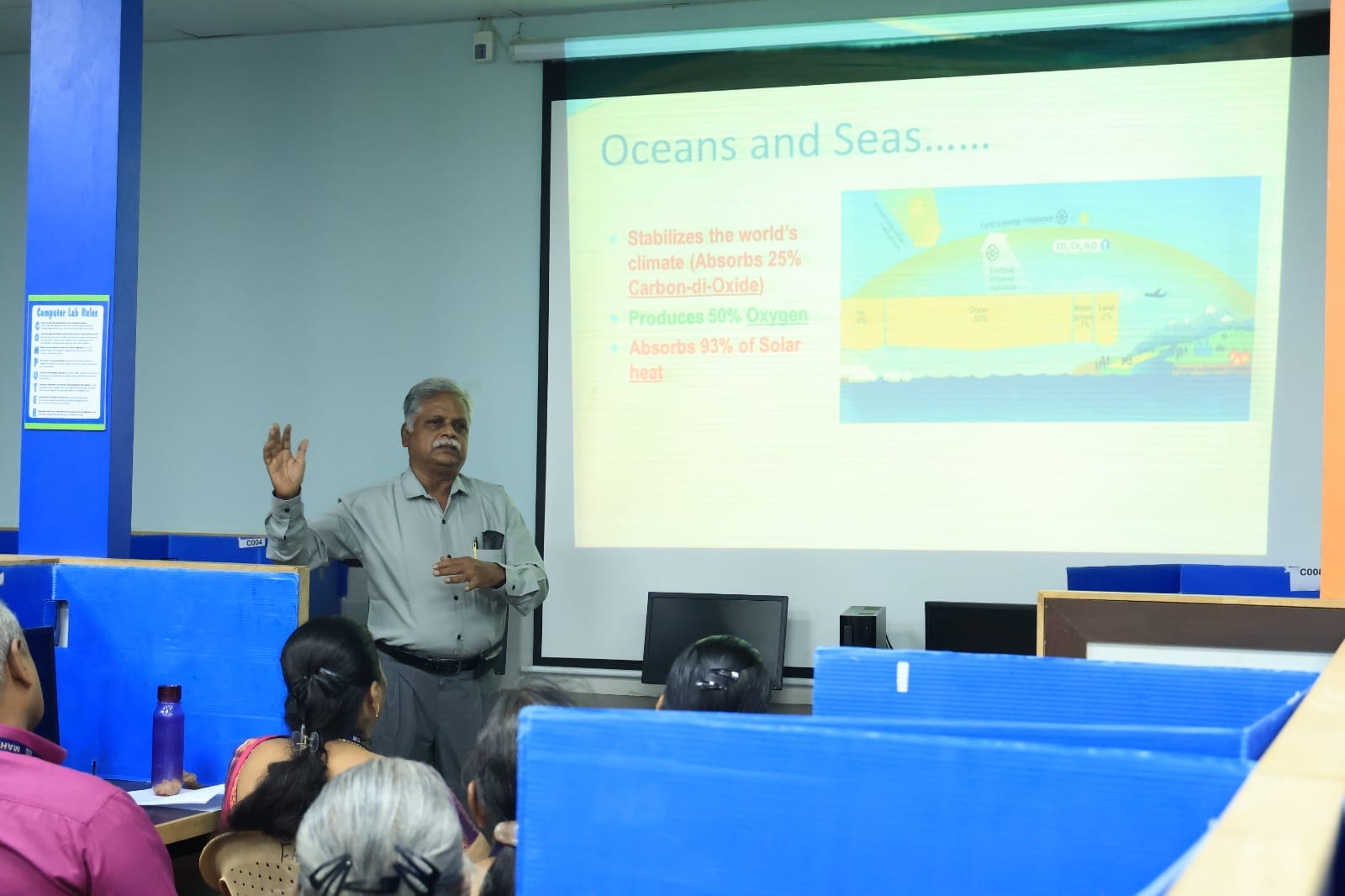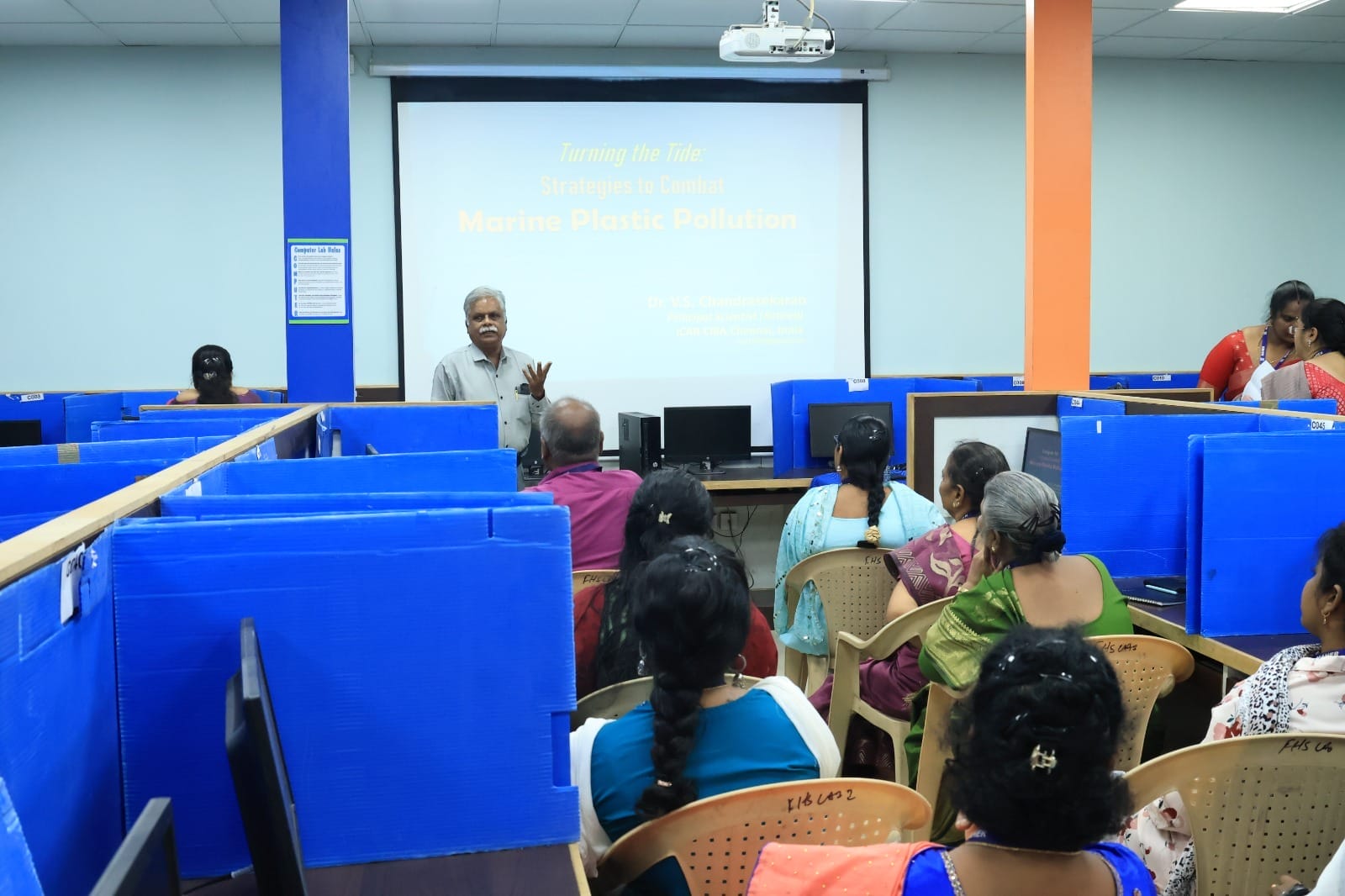 The highlight of the event was the keynote lecture by Chief Guest Dr. V. S. Chandrasekaran, Retired Principal Scientist at ICAR-CIBA and Guest Faculty at Indian Ocean Management, Anna University, Chennai. He delivered an enlightening address on the topic, “Turning the Tide: Strategies to Combat Marine Plastic Pollution.” In his talk, he elaborated on the alarming escalation of plastic waste in marine environments, the devastating consequences for marine life due to ingestion and entanglement, and the infiltration of microplastics into the human body through food and water. He further shed light on the harmful chemicals released by plastics and their potential effects on fertility and human health. Emphasizing the urgent need for action, he called upon the audience to adopt the principles of reducing, reusing, and recycling plastic as a vital step towards environmental preservation.