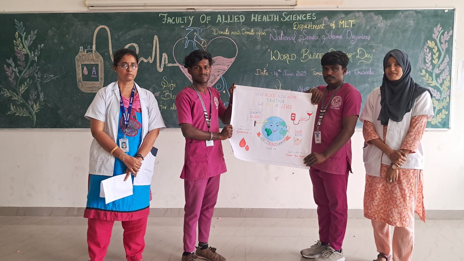 The Faculty of Allied Health Sciences (FAHS), MAHER, observed World Blood Donor Day on 16th June 2025 with meaningful activities aimed at promoting awareness about voluntary blood donation. The event was organized by the NSS Unit of FAHS in alignment with this year’s theme, “Give Blood, Give Hope: Together We Save Lives.”