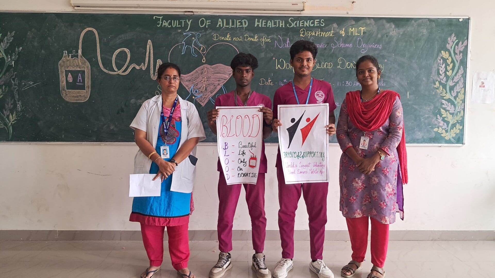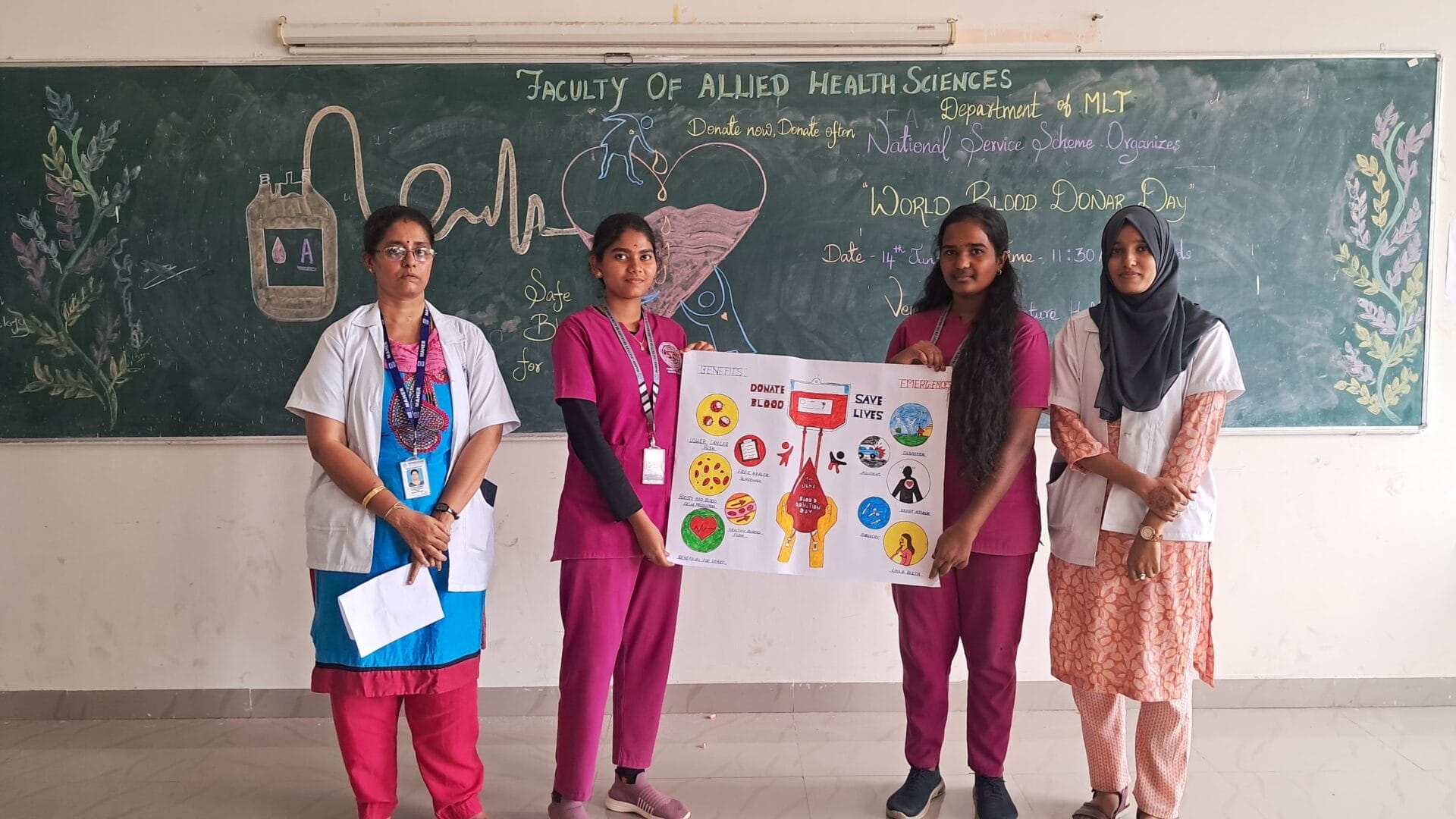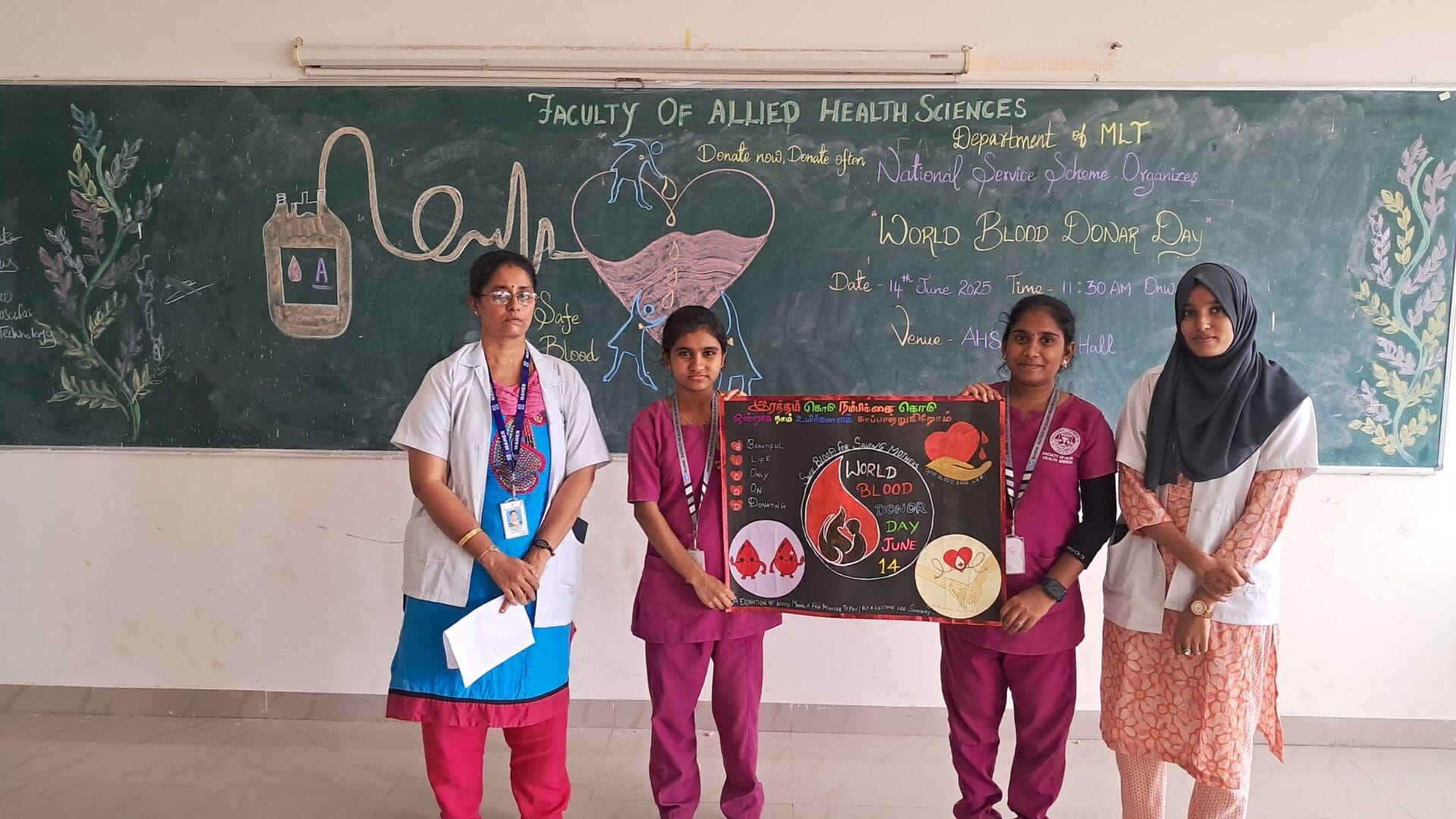 The Faculty of Allied Health Sciences (FAHS), MAHER, observed World Blood Donor Day on 16th June 2025 with meaningful activities aimed at promoting awareness about voluntary blood donation. The event was organized by the NSS Unit of FAHS in alignment with this year’s theme, “Give Blood, Give Hope: Together We Save Lives.”