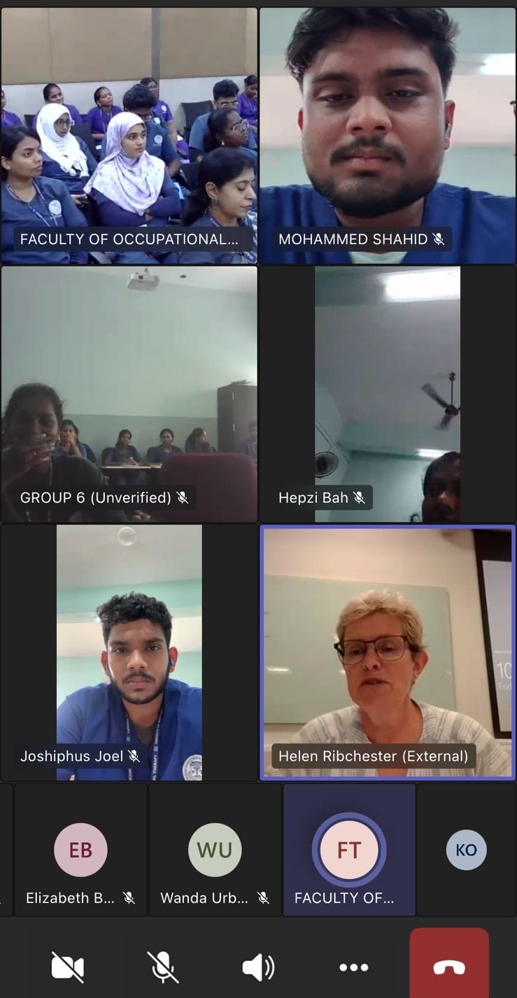 The Faculty of Occupational Therapy, MAHER, in collaboration with the University of Lincoln, England, organized an enriching Student Interaction Session on 4th July 2025, from 2:30 PM to 4:30 PM. This international academic exchange brought together students from both institutions for a dynamic virtual collaboration aimed at deepening cross-cultural understanding in the field of Occupational Therapy (OT).
