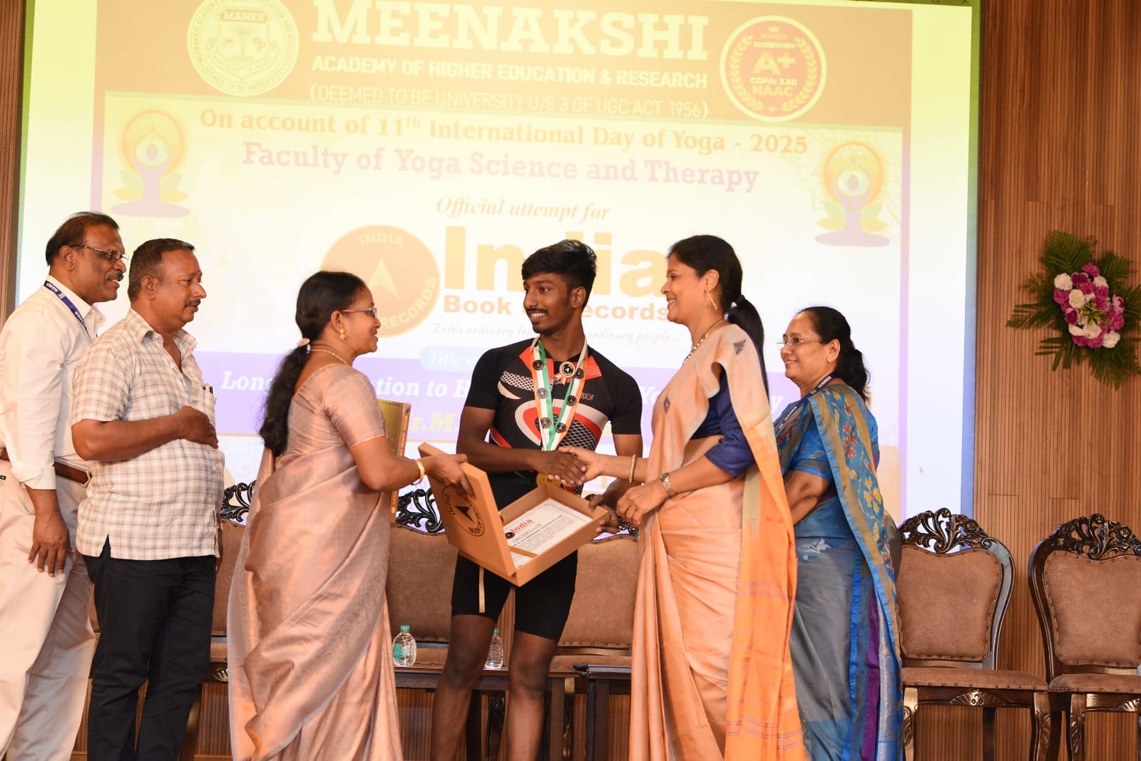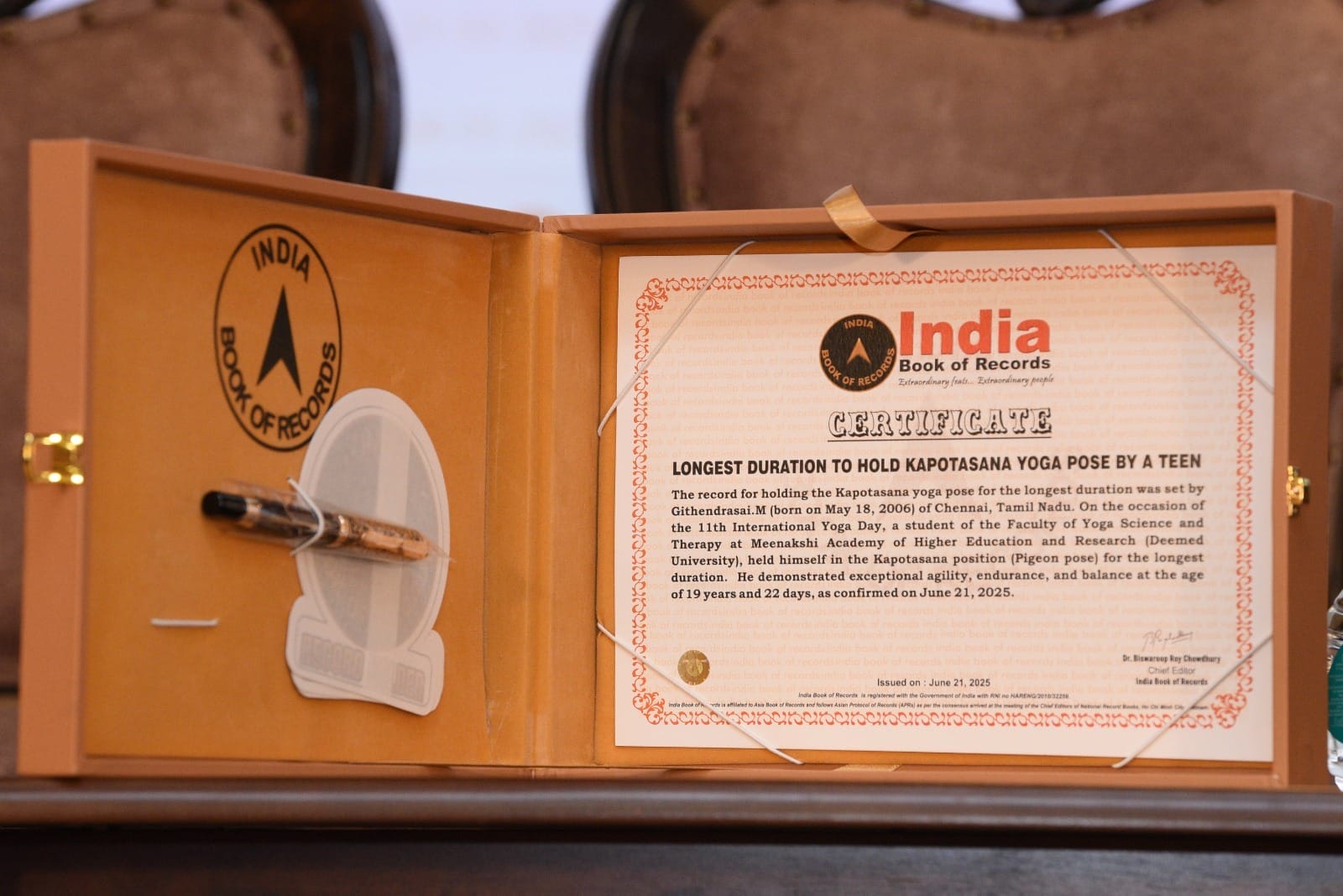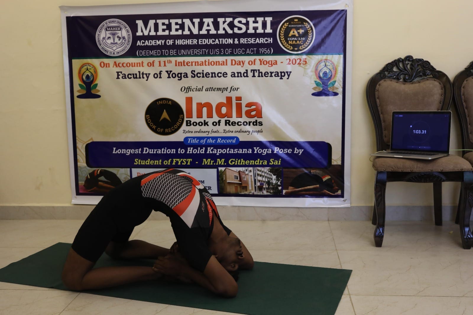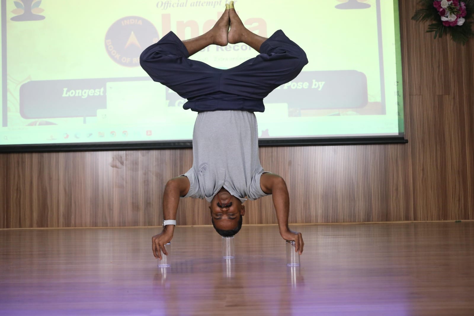 A key highlight of the event was a record attempt in Kapotasana (Pigeon Pose) by Mr. M. Githendra Sai, officially witnessed and validated by Mr. Vivek R. Nair, Adjudicator from the India Book of Records, who also delivered an appreciation address to acknowledge the dedication and excellence demonstrated.
