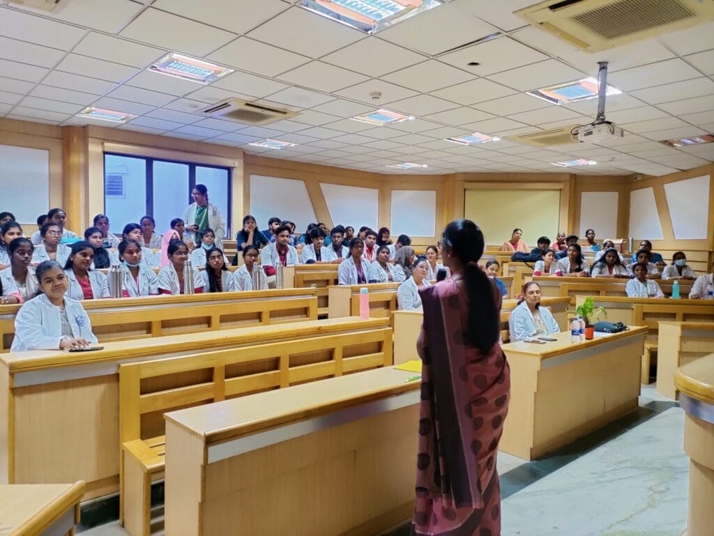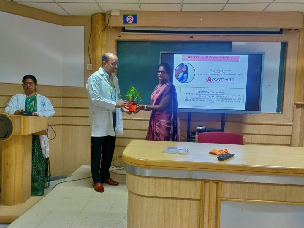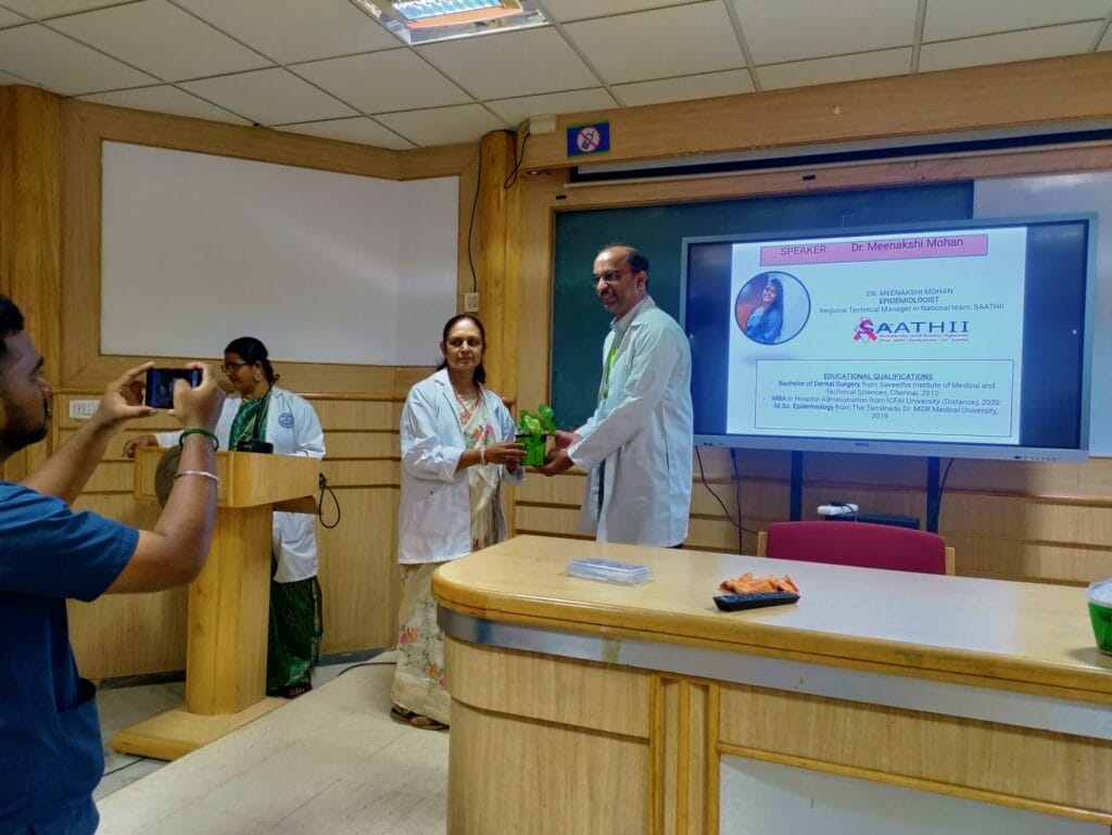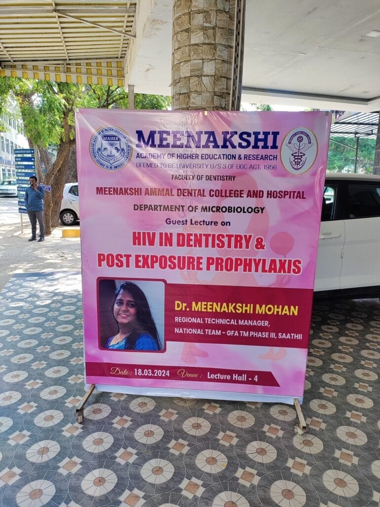 Department of Microbiology, Meenakshi Ammal Dental College & Hospital has conducted a guest lecture on “HIV in Dentistry and Post exposure Prophylaxis”. The speaker of the day was Dr. Meenakshi Mohan, Regional Technical Manager, NATIONAL TEAM-GFS TM GFA TM PHASE III, SAATHII. The program included Overview of HIV/AIDS: Epidemiology and global impact, HIV Transmission and Risks in Dentistry, Patient Screening and Management, Post-Exposure Prophylaxis (PEP),Stigma Reduction and Patient Education.