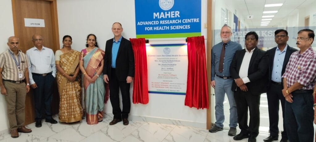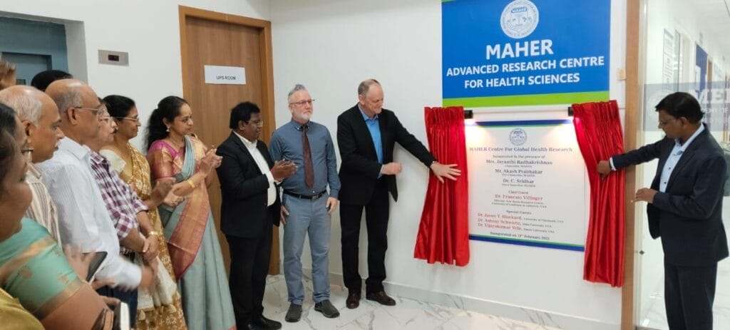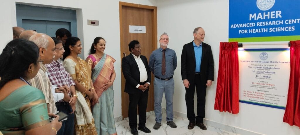 With growing global health challenges like infectious disease outbreaks, the need for robust global health research is more critical than ever. To advance knowledge and develop evidence-based solutions to address global health disparities, an initiative, MAHER Centre for Global Health Research was inaugurated at MAHER main campus, KK Nagar West, Chennai on 19, February 2025 in the presence of Mrs. Jayanthi Radhakrishnan (Chancellor, MAHER), Mr. Akash Prabhakar (Pro-Chancellor, MAHER) , Dr. C. Sridhar (Vice-Chancellor, MAHER). Dr. C. Krithika (Pro-Vice-Chancellor, MAHER) and Dr. V. Sureka Varalakshmi (Registrar, MAHER). The Chief Guest for the inauguration was Dr. François Villinger, Director, New Iberia Research Centre, University of Louisiana at Lafayette, USA and special guests were Dr. Jason T. Blackard (University of Cincinnati, USA), Dr. Antony Schwartz (Duke University, USA) and Dr. Vijayakumar Velu (Emory University, USA). Dr. N. Arunagirinathan (Dean Research, MAHER), Dr. P. Balakrishnan (Chief Scientist – Infectious Diseases), Dr K. Srinivasa Galu (Medical Director), Dr. P. Mohanraj (NACO-ART Nodal Officer) and Dr. S. Sivasankari (Microbiology Professor) from Meenakshi Medical College hospital and Research Institute (MMCHRI) and a team of other research scientists participated in this event. The launch of MAHER Centre for Global Health Research at MAHER (Deemed to be University) is focussed on sustainable and inclusive partnerships and building capacity for the next generation of global health researchers.