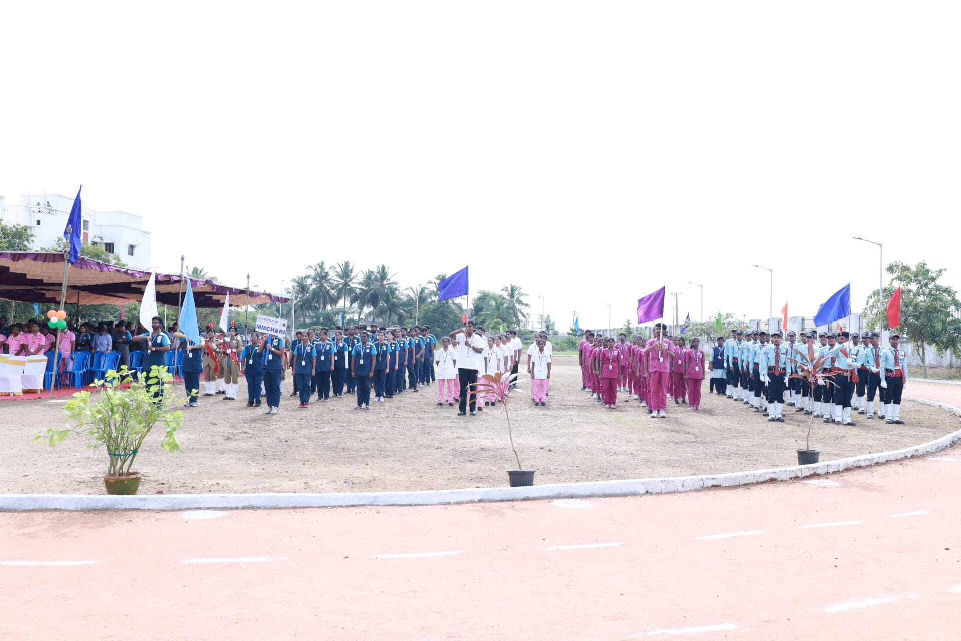 The programme commenced at 9:00 AM with the arrival of the Chief Guest, Comdr. Digvijay Singh, Senior Met & Education Officer, INAS 312, INS Rajali, Arakkonam. The celebration began with Thamizh Thai Vazhthu, followed by the inspection of the parade and salute by the Chief Guest. At 9:25 AM, the National Flag was hoisted, and the gathering joined in singing the National Anthem, filling the atmosphere with patriotic spirit.