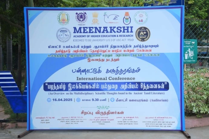 The Department of Tamil, Faculty of Humanities and Science, Meenakshi Academy of Higher Education and Research (MAHER), in collaboration with the Tamil Nadu State Council for Science and Technology, the World Tamil Research Centre, and the Academy of Sciences Chennai, organized an International Conference on April 16, 2025. The conference centered around the theme “An Overview on Multidisciplinary Scientific Thoughts Found in Ancient Tamil Literature” and brought together scholars and researchers from around the globe.