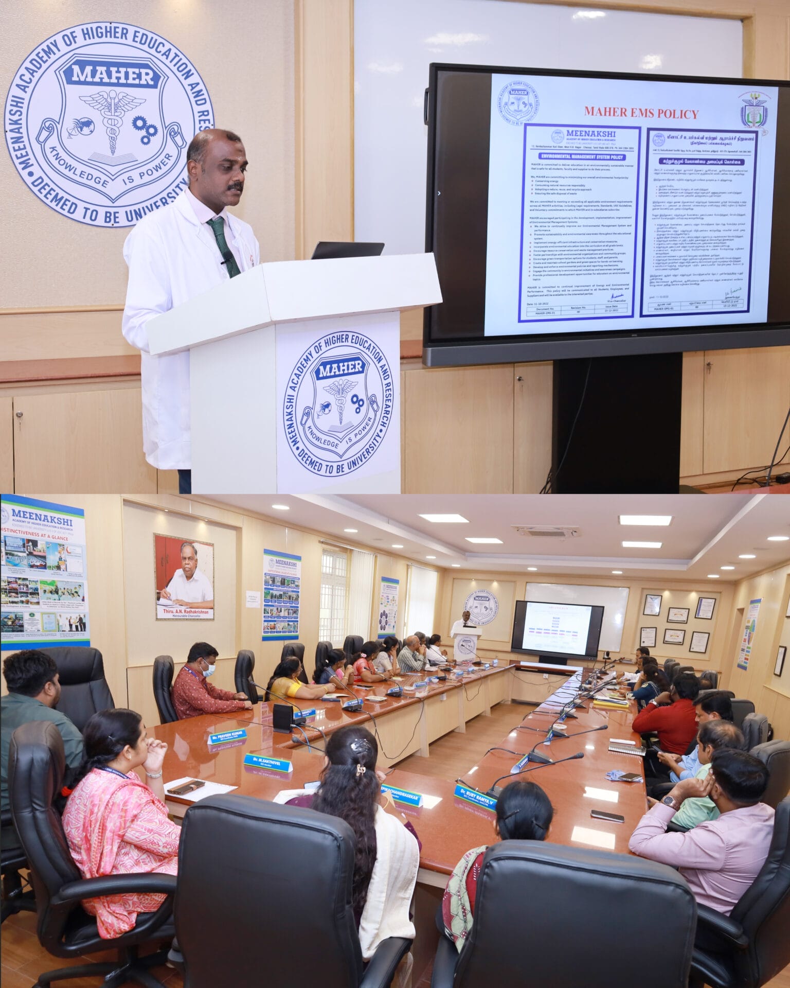 Meenakshi Medical College Hospital & Research Institute (MMCHRI) successfully underwent the ISO 14001:2015 Environmental Management System (EMS) external inspection on 18 November 2025. The audit evaluated various aspects of environmental governance, including waste management, safety protocols, resource efficiency, and compliance with regulatory and international standards. The visit highlighted the institution’s systematic efforts to maintain environmentally responsible operations, ensure regulatory compliance, and promote best practices in sustainability within healthcare.