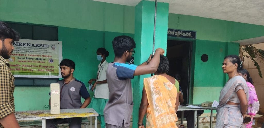 Under the patronage of Meenakshi Academy of Higher Education and Research, a special medical camp was held at the Government Primary School in Parandhur village on 08.07.2024. The special medical camp was organized by Meenakshi Medical College & Hospital in coordination with the Department of Community Medicine, in collaboration with Unnat Bharat Abhiyan and the National Service Scheme. Specialists in Orthopedics, General Medicine, Pediatrics, Ophthalmology, and Obstetrics and Gynecology provided examinations and diagnoses. The camp also monitored patients’ blood pressure, blood sugar levels, hemoglobin levels, and urinary protein and sugar levels.