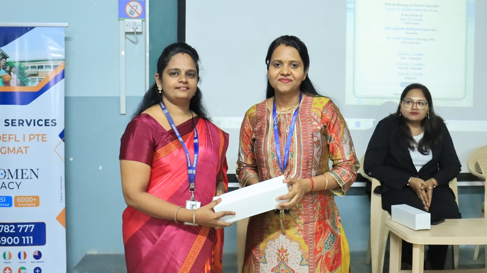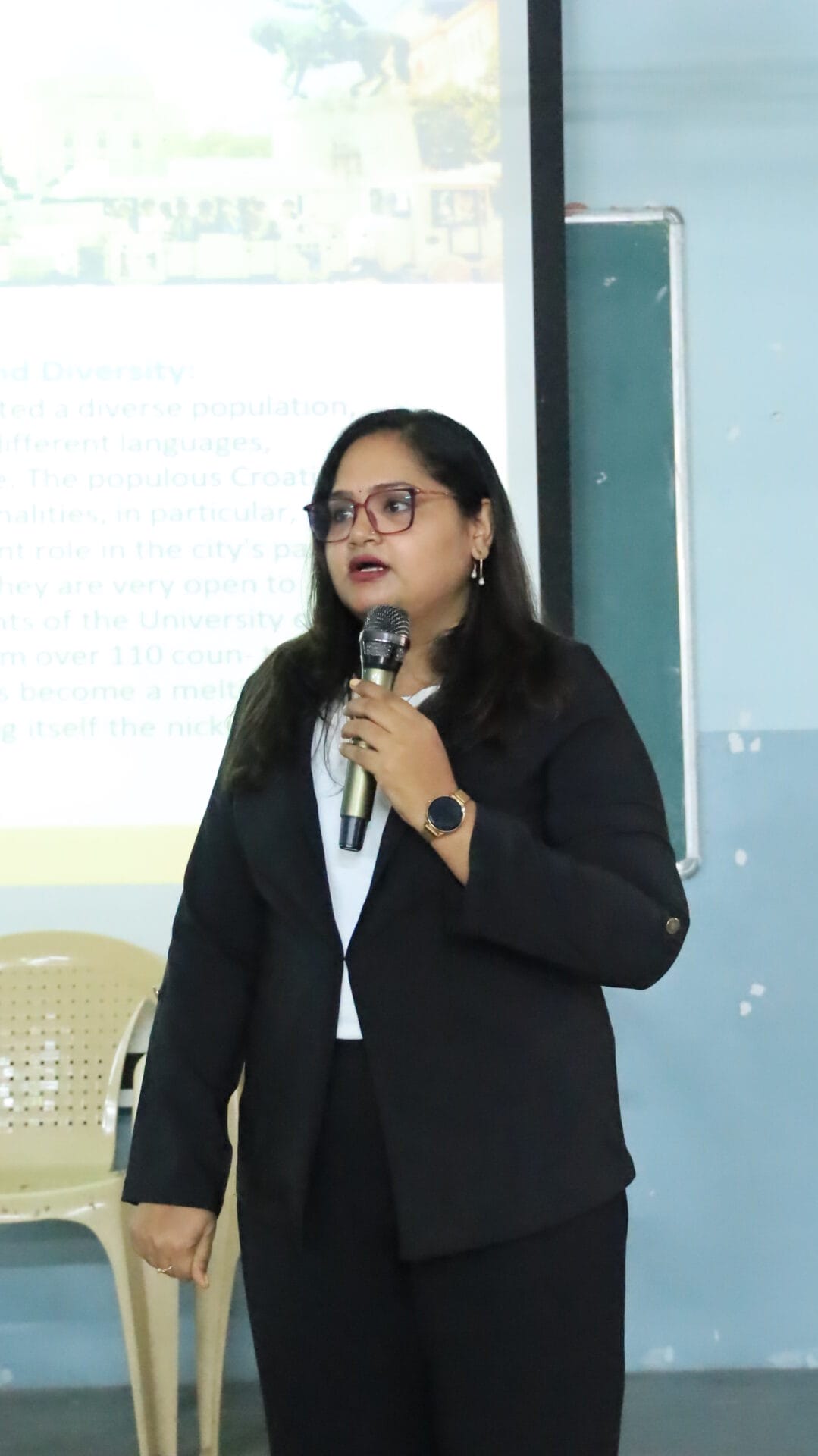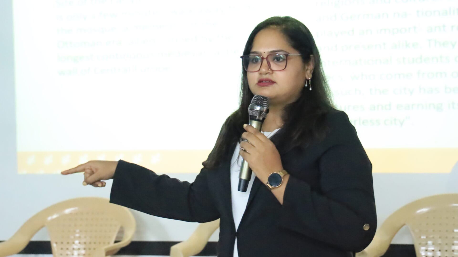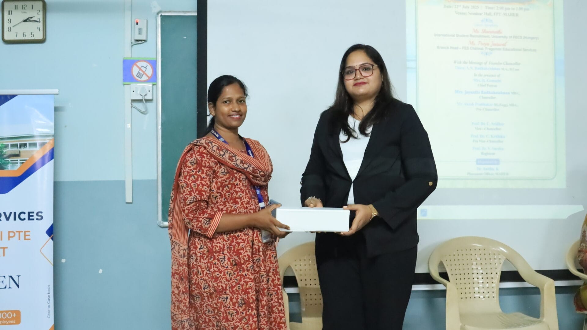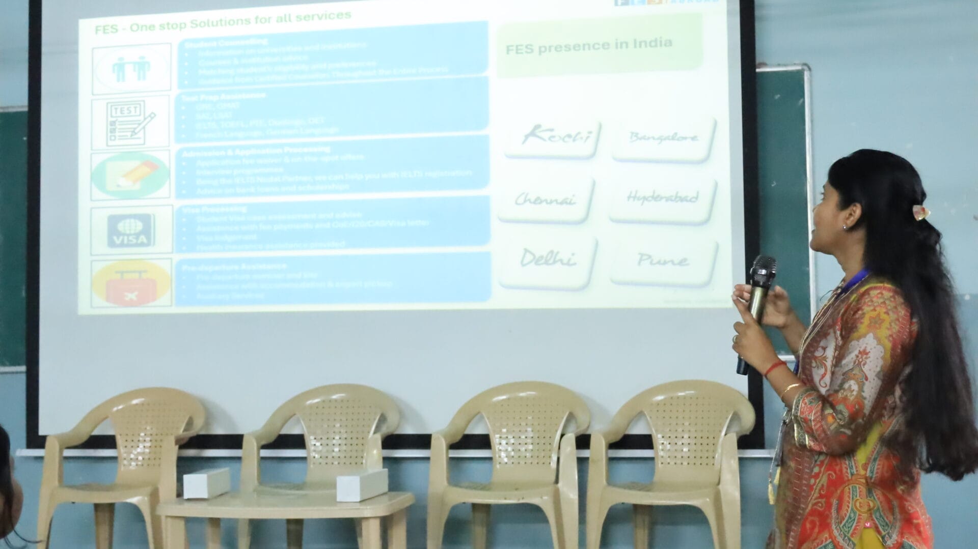 The event featured two distinguished guest speakers: Ms. Shanmathi, representing International Student Recruitment from the University of Pécs, Hungary, and Ms. Pooja Jaiswal, Branch Head of FES Chennai, Fragomen Educational Services. Both speakers provided in-depth insights into global higher education systems, application procedures, scholarships, and the career prospects awaiting Indian students abroad. They also discussed the role of recruitment agencies, university collaborations, and visa processes, making the session highly informative and engaging.