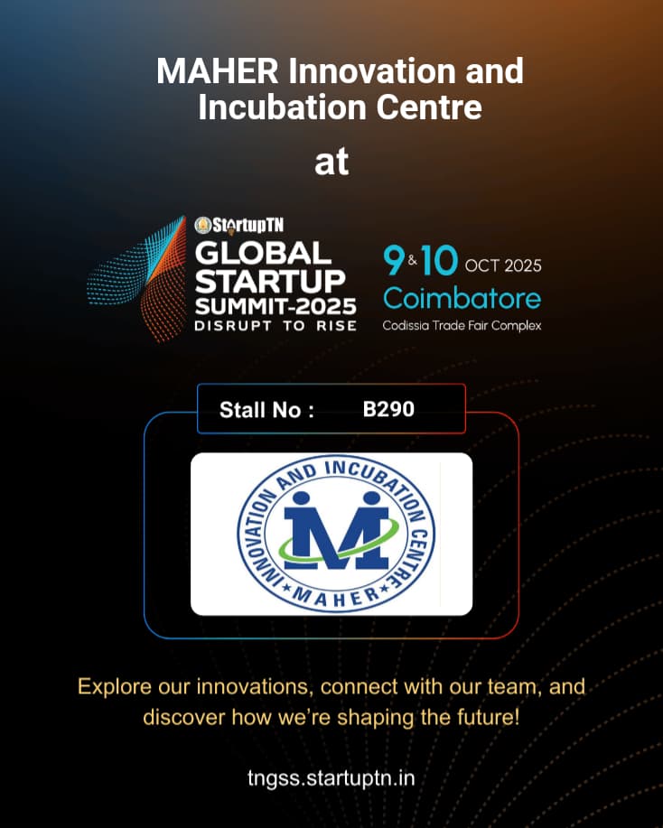 MAHER Innovation and Incubation Centre is proud to be a part of the Tamil Nadu Global Startup Summit 2025, held on 9th and 10th October 2025. The centre is showcasing its cutting-edge innovations and entrepreneurial initiatives at Stall B290.