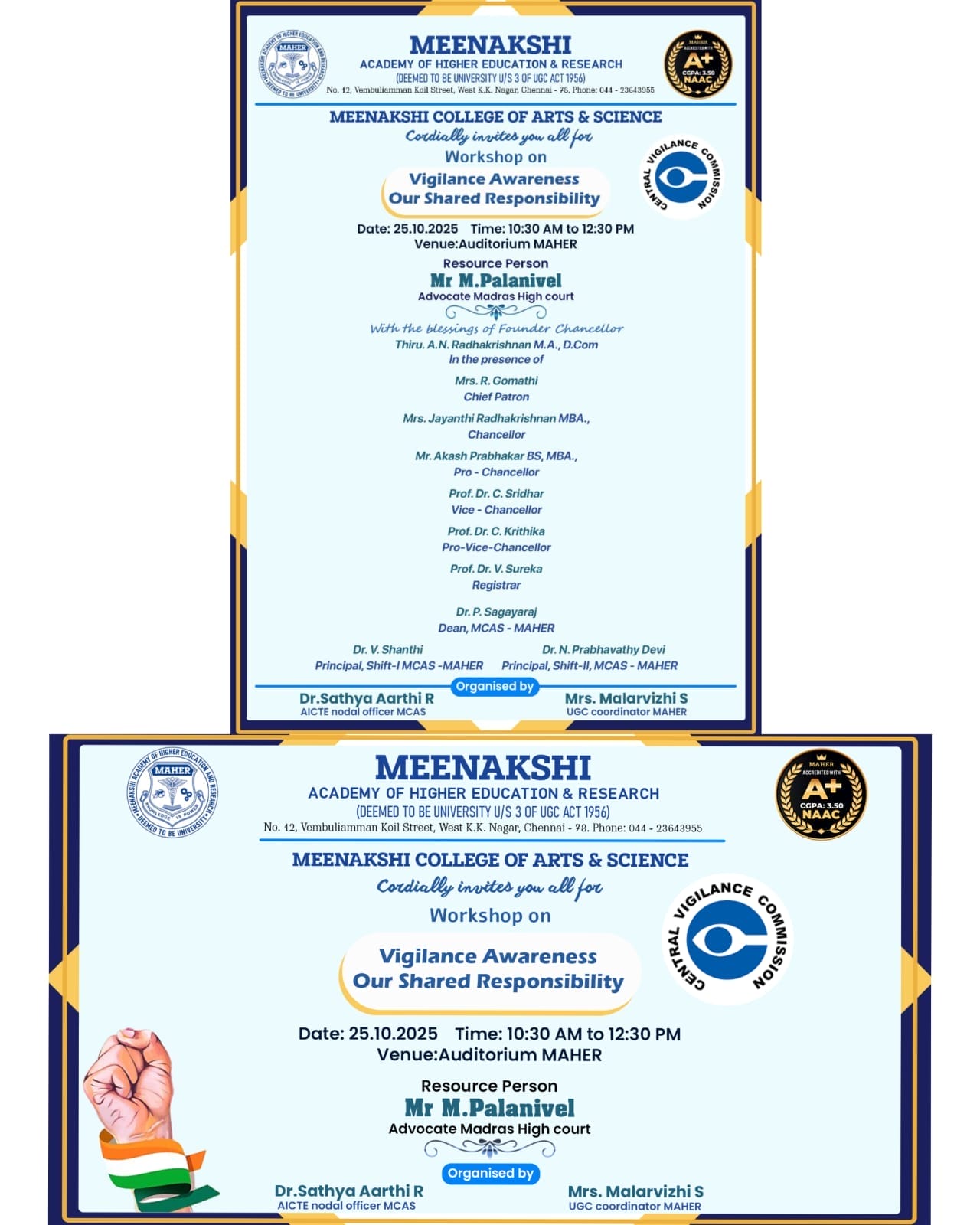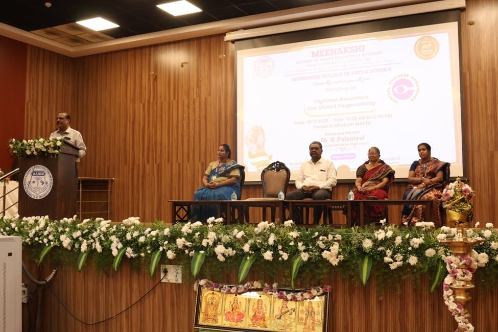 The programme commenced with the Tamil Thaai Vazhthu, followed by a welcome address by Dr. P. Sagayaraj, Dean, Meenakshi College of Arts and Science (MCAS). The Chief Guest, Mr. M. Palanivel, Advocate, Madras High Court, delivered an insightful and thought-provoking lecture on the importance of vigilance and the harmful consequences of corruption. He discussed the various forms of vigilance, relevant anti-corruption laws, and the essential role of individual integrity in building a just society. He urged everyone to practice ethical conduct and contribute to creating a culture of honesty and fairness.