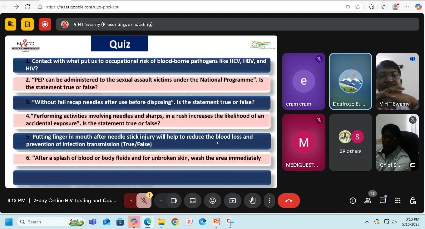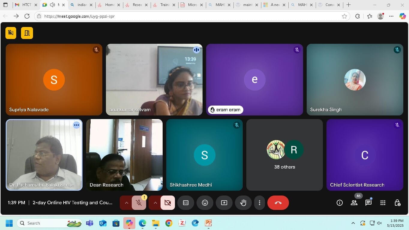 The Centre for Global Health Research, Meenakshi Academy of Higher Education and Research (MAHER), successfully conducted a 2-day Online HIV Testing and Counselling Training (HTCT) Certification Program fromMay 15th –May 16, 2025. This specialized training was designed to build capacity among healthcare professionals working in hospitals, diagnostic laboratories, and blood banks—especially those accredited or seeking accreditation under NABL (ISO 15189:2022) and NABH.
